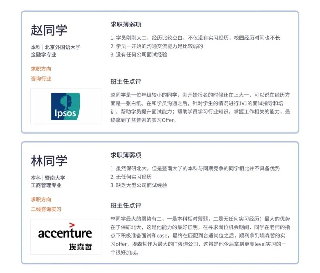 咨询的全职求职,对实习经历要求还是比较严格的。为此,我们先帮助同学辅导+推荐到了一份实习机会作为铺垫