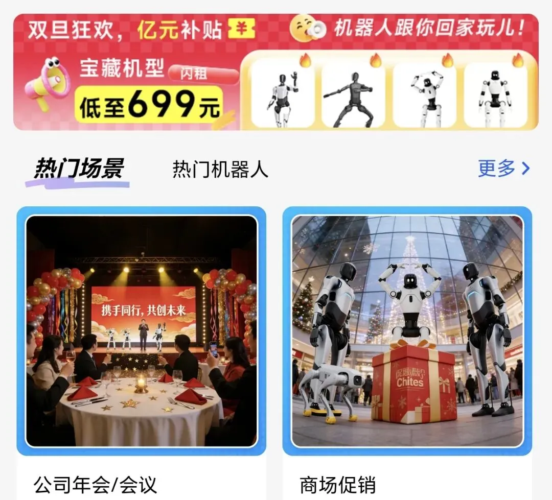 于是,“擎天租”平台的发布便顺理成章。它想做的,是把机器人租赁变得像租充电宝一样便捷。企业办年会需要暖场、商场做促销需要吸睛、网红直播需要新噱头......都可以在平台下单,租金最低从699元/天起。平台聚合租赁商、内容创作者和设备,目标直指“打通人形机器人走向大众的最后一公里”。