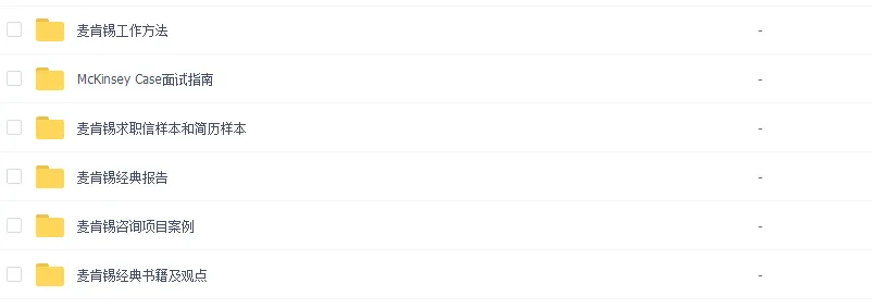 本期精选麦肯锡资料大合集包括:麦肯锡工作方法(音频+笔记+PPT)、40份麦肯锡经典报告、100份各行业项目案例、麦肯锡经典书籍、面试指南、麦肯锡求职信样本和简历样本等, 公众号后台回复 “麦肯锡” 领取资料。