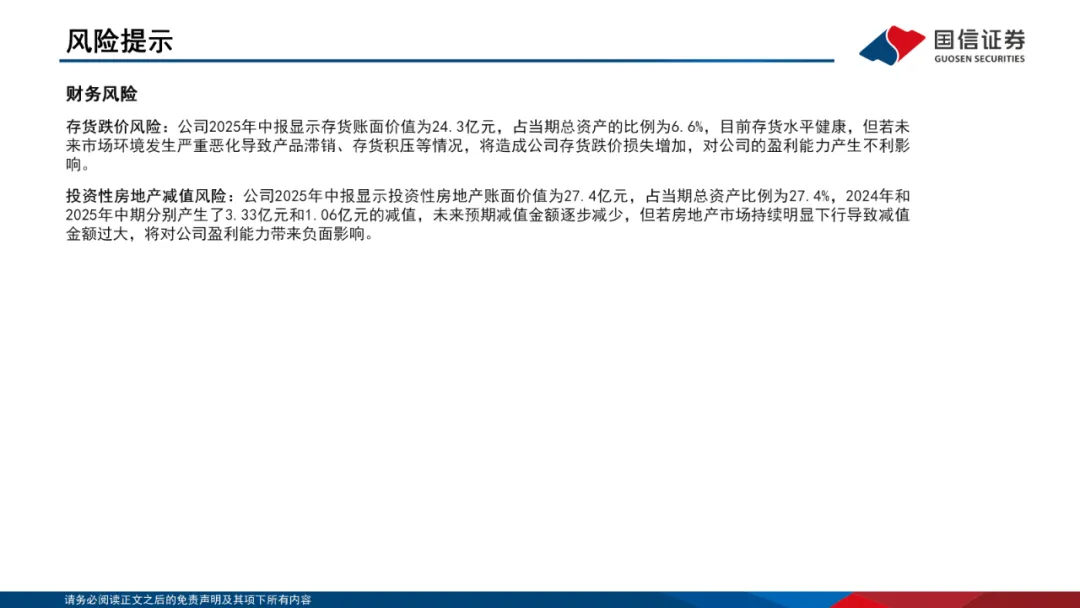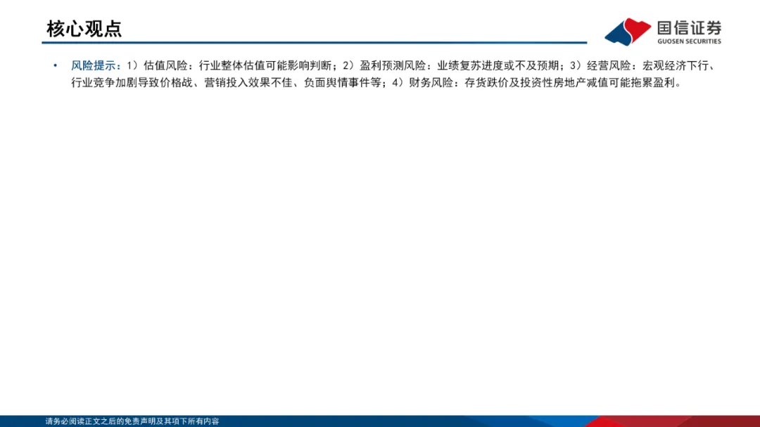 风险提示:1)估值风险:行业整体估值可能影响判断;2)盈利预测风险:业绩复苏进度或不及预期;3)经营风险:宏观经济下行、行业竞争加剧导致价格战、营销投入效果不佳、负面舆情事件等;4)财务风险:存货跌价及投资性房地产减值可能拖累盈利。