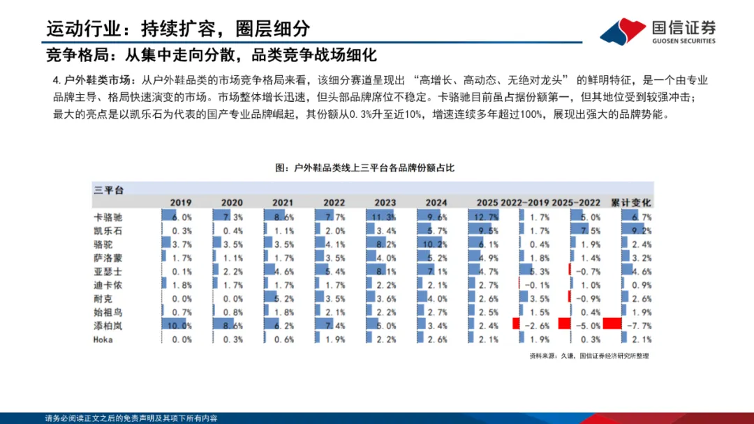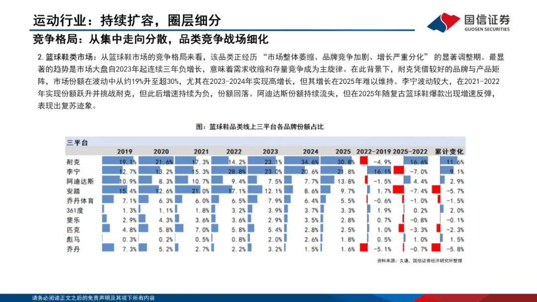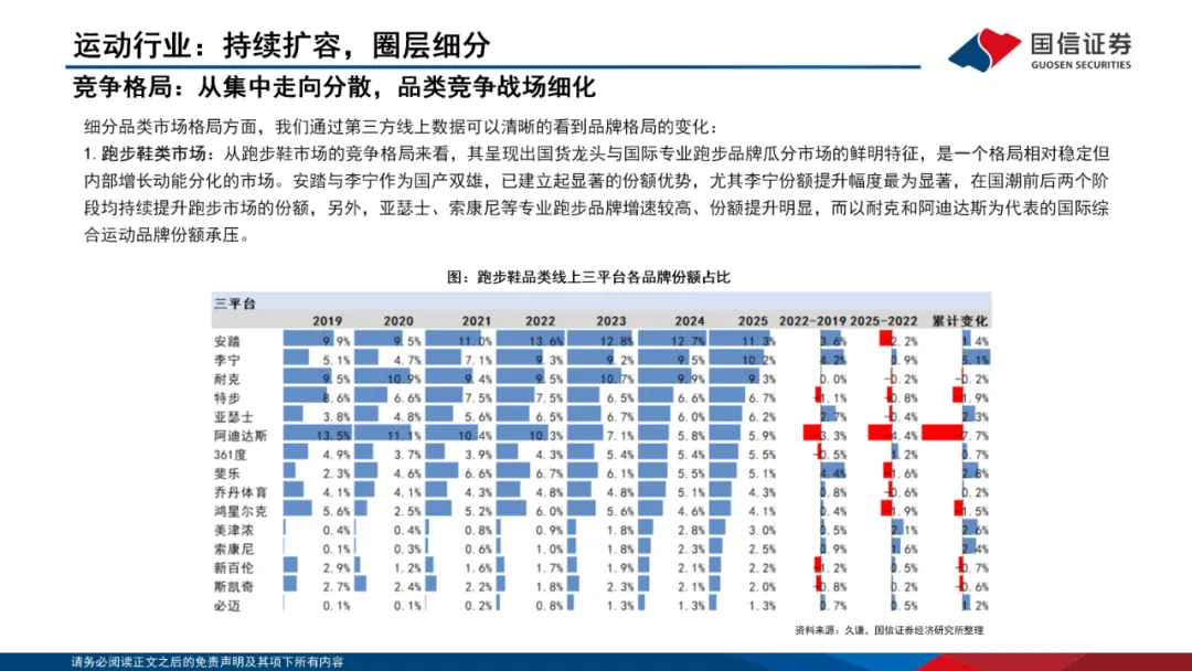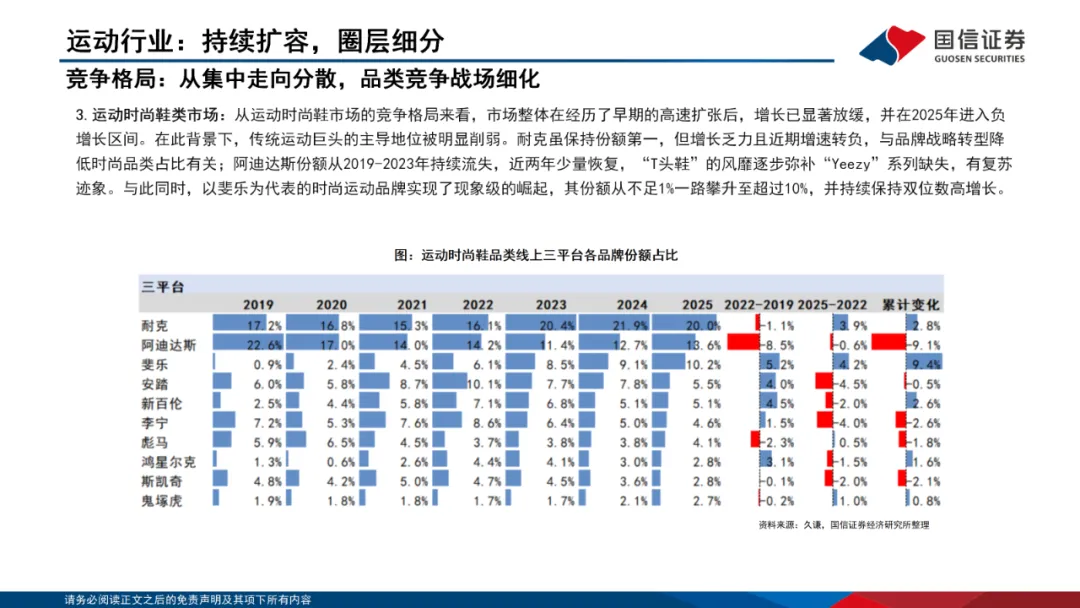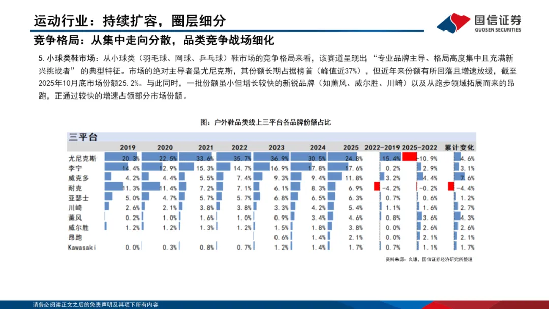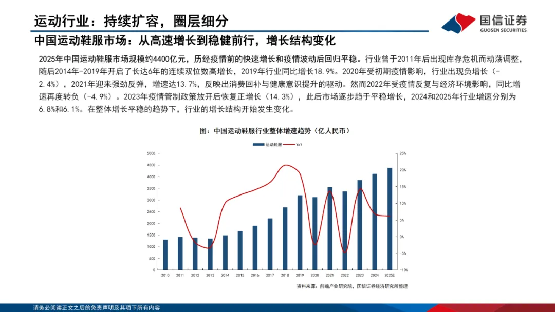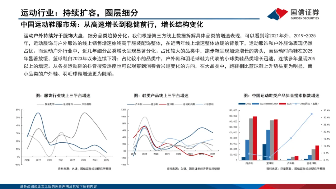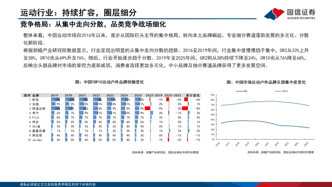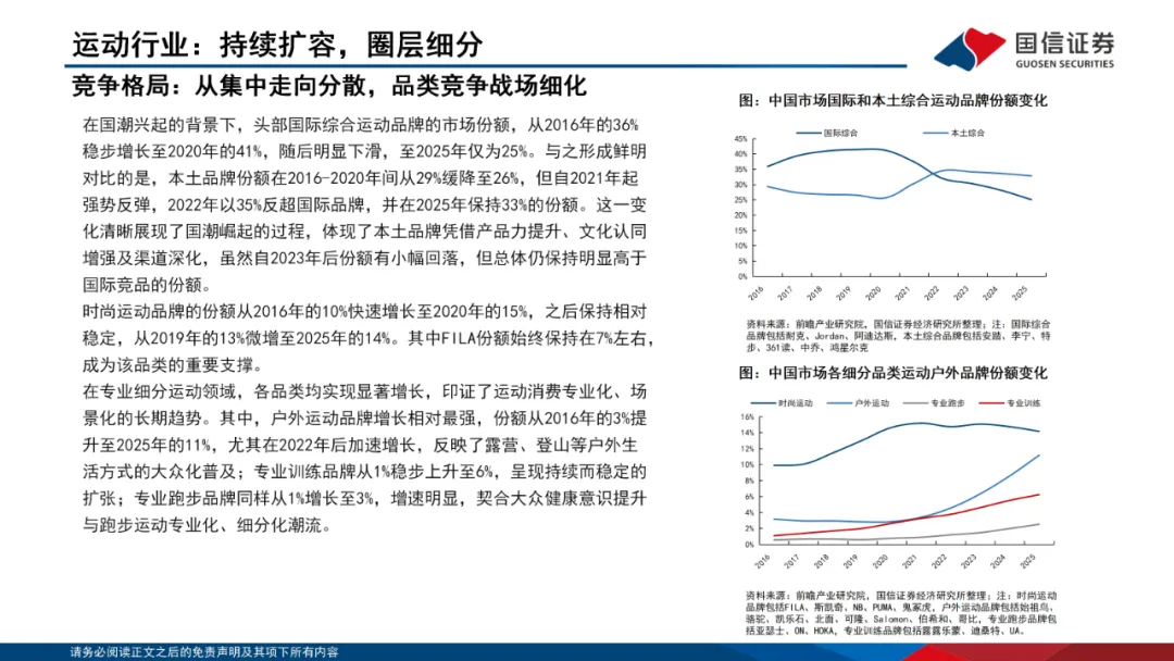 运动行业:持续扩容,圈层细分。中国运动户外鞋服行业2025年市场规模约4400亿元,在经历疫情前的高速增长和疫情波动后,目前增速放缓在6%左右,同时内部结构发生显著变化:1)专业运动品类增长强于时尚运动,包括跑步、户外和细分小球运动等领域增长强劲,但篮球市场较为承压;2)品牌格局从集中走向分散,从2019-2025年,行业CR10从76%降至68%,先后发生国货崛起到垂类占优的趋势。