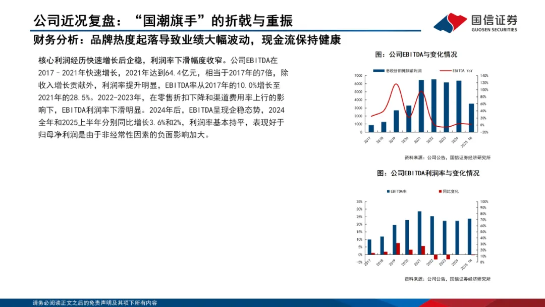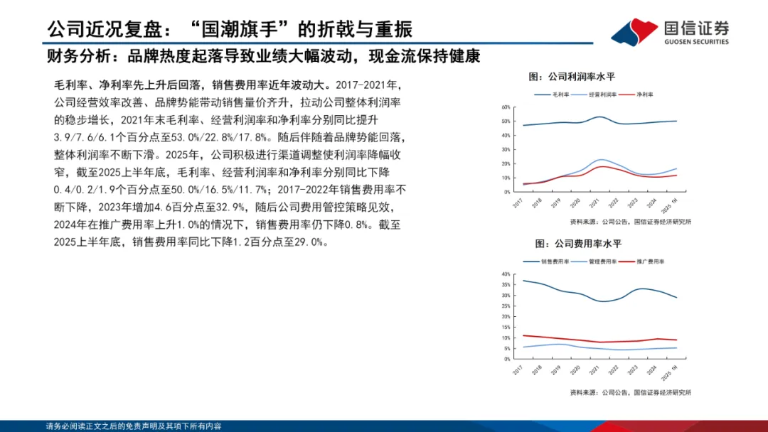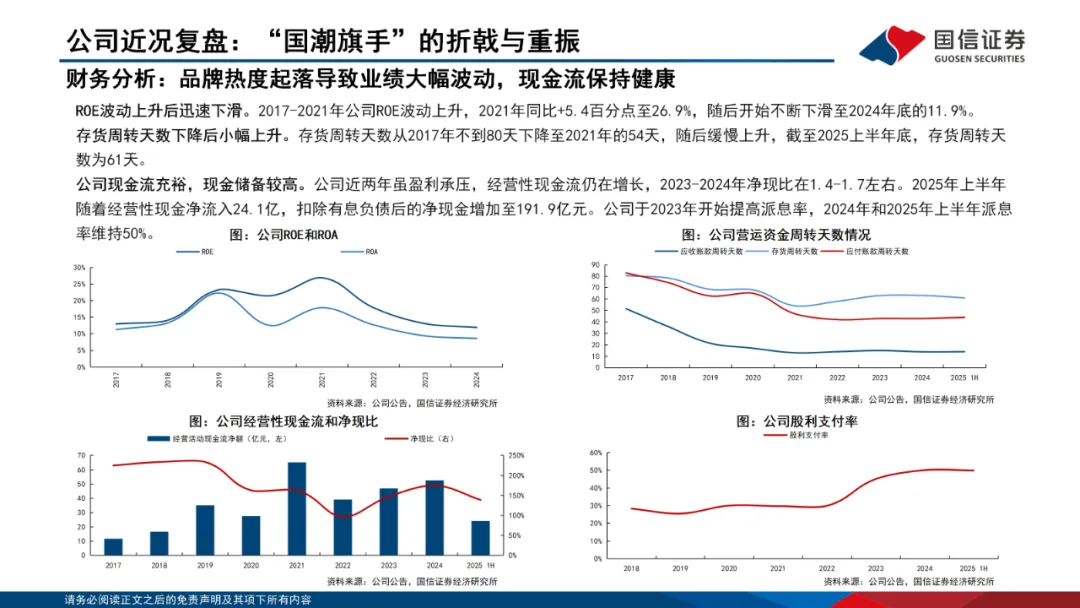 渠道布局:调整初现成效,圈层细化有望开拓增量市场。2024年起,公司主动缩减直营门店规模,控制门店面积,带动直营经营利润率从2023年约10%的低谷回升至2025年上半年的中双位数。批发渠道保持稳定,加盟门店数小幅增长,反映经销商信心逐步恢复。2025年底,公司推出融合奥运元素的“龙店”和户外专门店,通过店型细分化精准切入圈层市场。若品牌势能回升,现有门店的店效和折扣率改善有望撬动经营杠杆,推动新一轮渠道扩张。