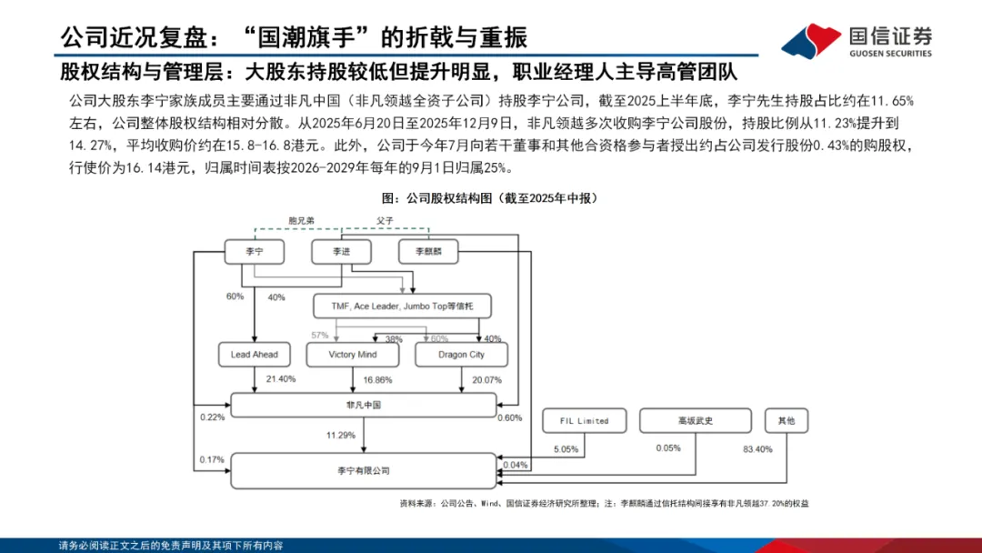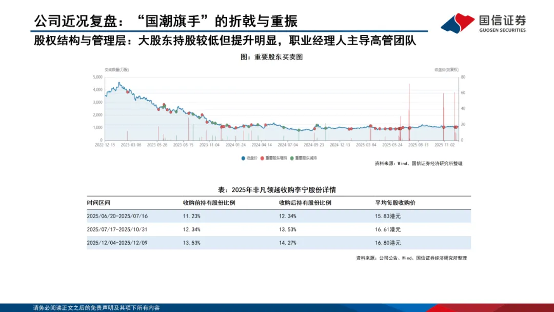 公司近况复盘:“国潮旗手”的折戟与重振。2019-2021年,公司在国潮红利中产品力与品牌力共振,业绩大幅增长,2021年净利润达40亿元,相当于3年前的5.6倍;2022-2024年,随着国潮退温及宏观经济压力,公司渠道结构和库存问题凸显,进入调整期,营收增速放缓至个位数,净利率从高双位数回落至10%出头;2025年,经过库存管控与渠道优化,公司直营渠道经营利润率见底回升,同时拿下至2028年的奥运周期的核心营销资源,新产品与新店型也开始同步发力,有望重振品牌势能。股权层面,李宁家族通过非凡领越持续增持,持股比例从11.23%升至14.27%,彰显长期信心。