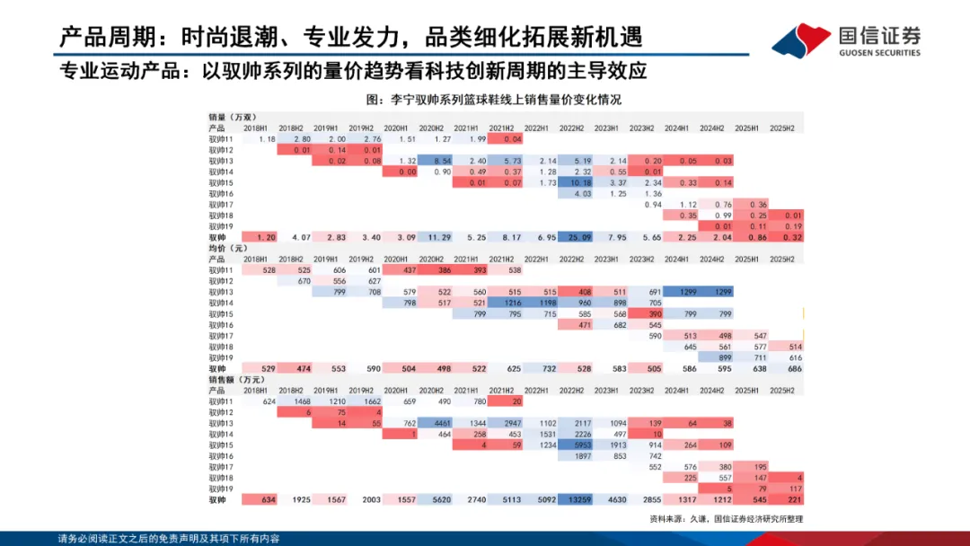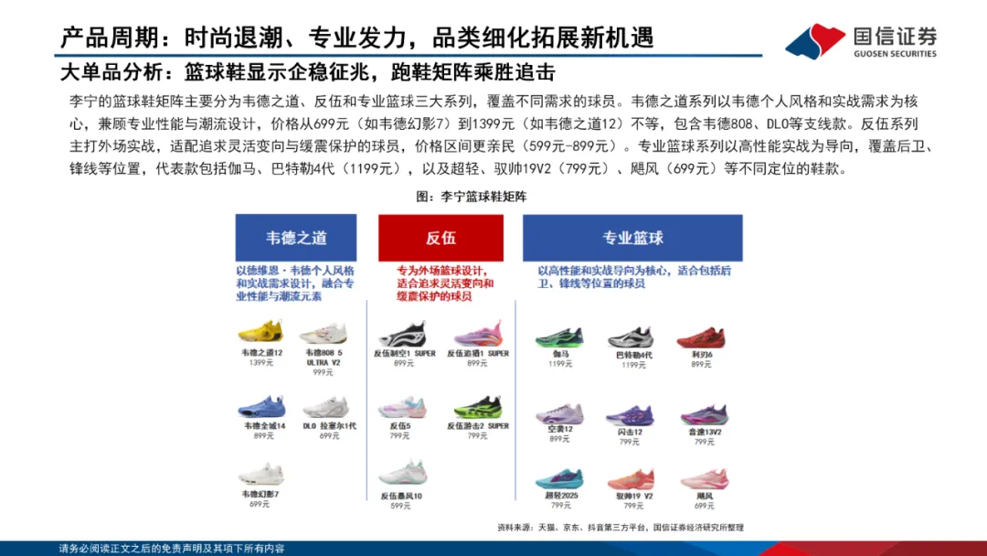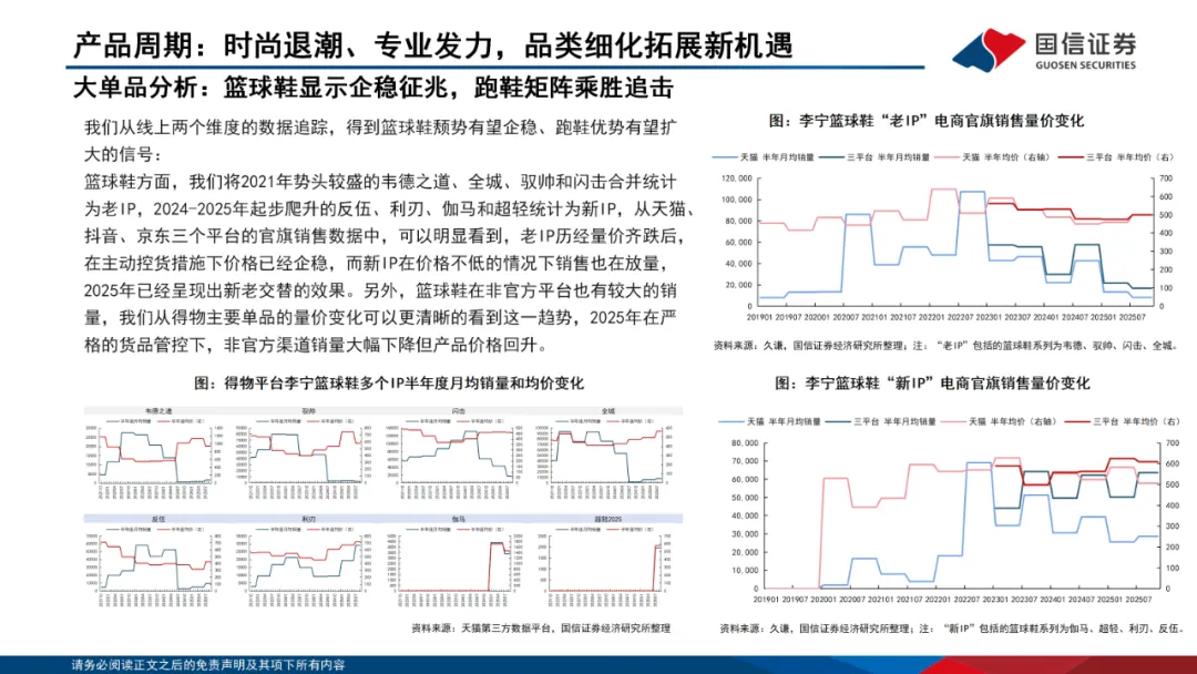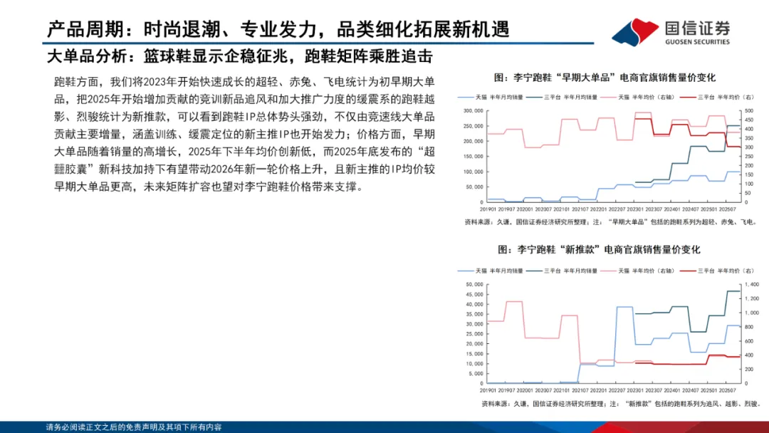 产品周期:时尚退潮、专业发力,品类细化拓展新机遇。上一轮品牌势能上升期,公司的主导品类是篮球和运动生活,其在近几年大幅回撤,占比从2021年峰值71%下滑至2025年上半年的46%;跑步品类强势崛起,2023-2024年增速达25%-45%,占34%成为公司第一大品类。公司篮球鞋在经历量价齐跌后,价格逐步企稳,新IP系列销量攀升;跑鞋矩阵持续扩张,2025年底发布的“超䨻胶囊”科技有望助推跑鞋延续增长动能。同时,公司推出“荣耀金标”系列和户外系列,覆盖泛运动生活多元需求,为品类注入新增量。