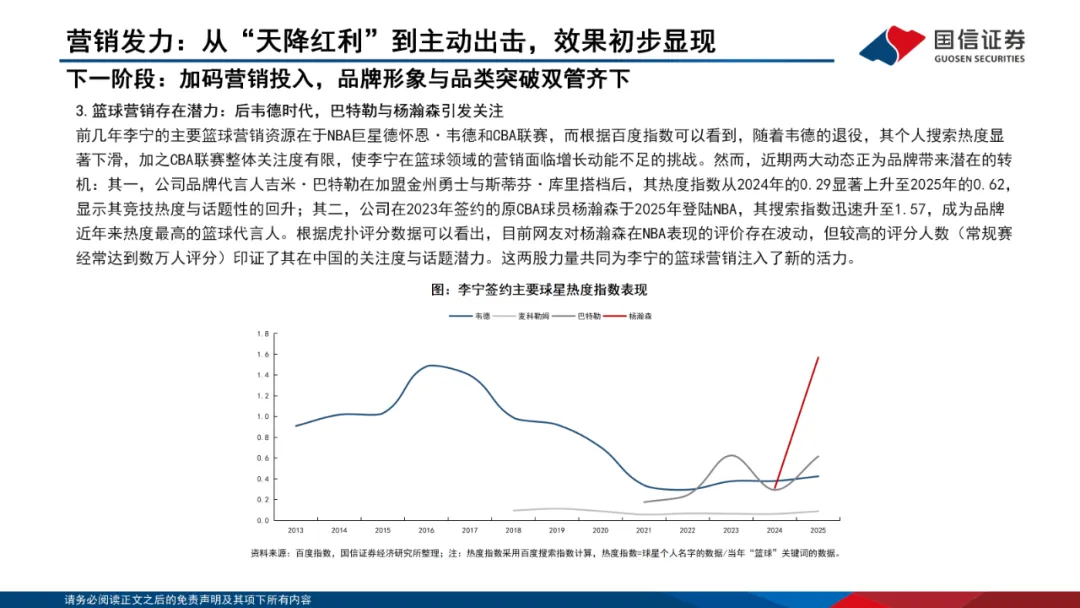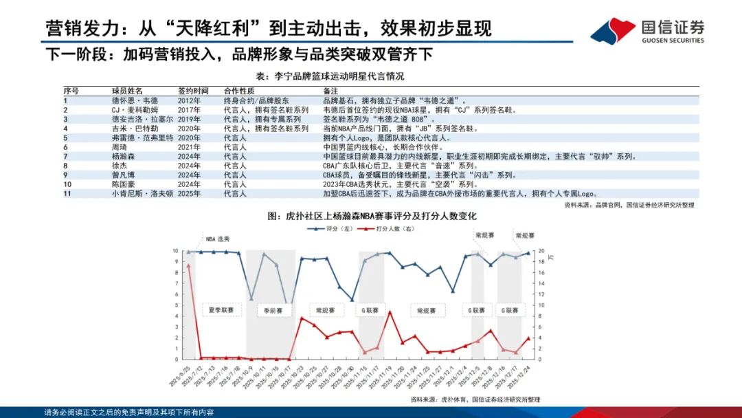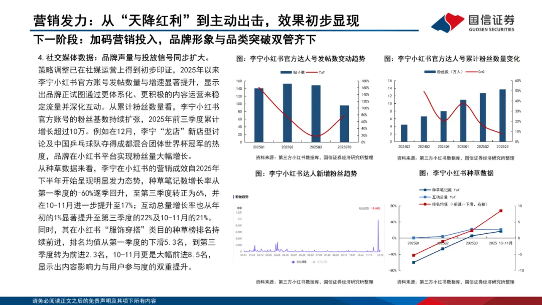 营销发力:从“天降红利”到主动出击,效果初步显现。李宁营销费用率过去多年低于10%,2025年起计划提升至低双位数,营销资源加持方向包括:签约中国奥委会,锁定2025-2028年核心奥运资源;加大跑步品类投入,通过马拉松赛事与精英运动员强化新品曝光;篮球领域代言人杨瀚森、吉米巴特勒的影响力上升,有望弥补韦德退役后的营销空白。社交媒体运营同步强化,官方账号发帖数量、粉丝量与“种草”互动数据同步增长。