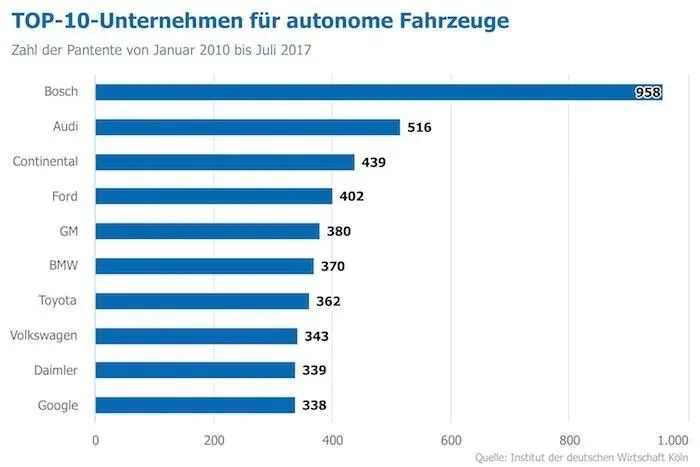 全世界52%的自动驾驶专利来自德国,排名前十的企业中有六家是德国企业,而其中的NO.1就是博世,博世在2010-2017年之间以958项自动驾驶专利排名世界企业第一,远超谷歌。