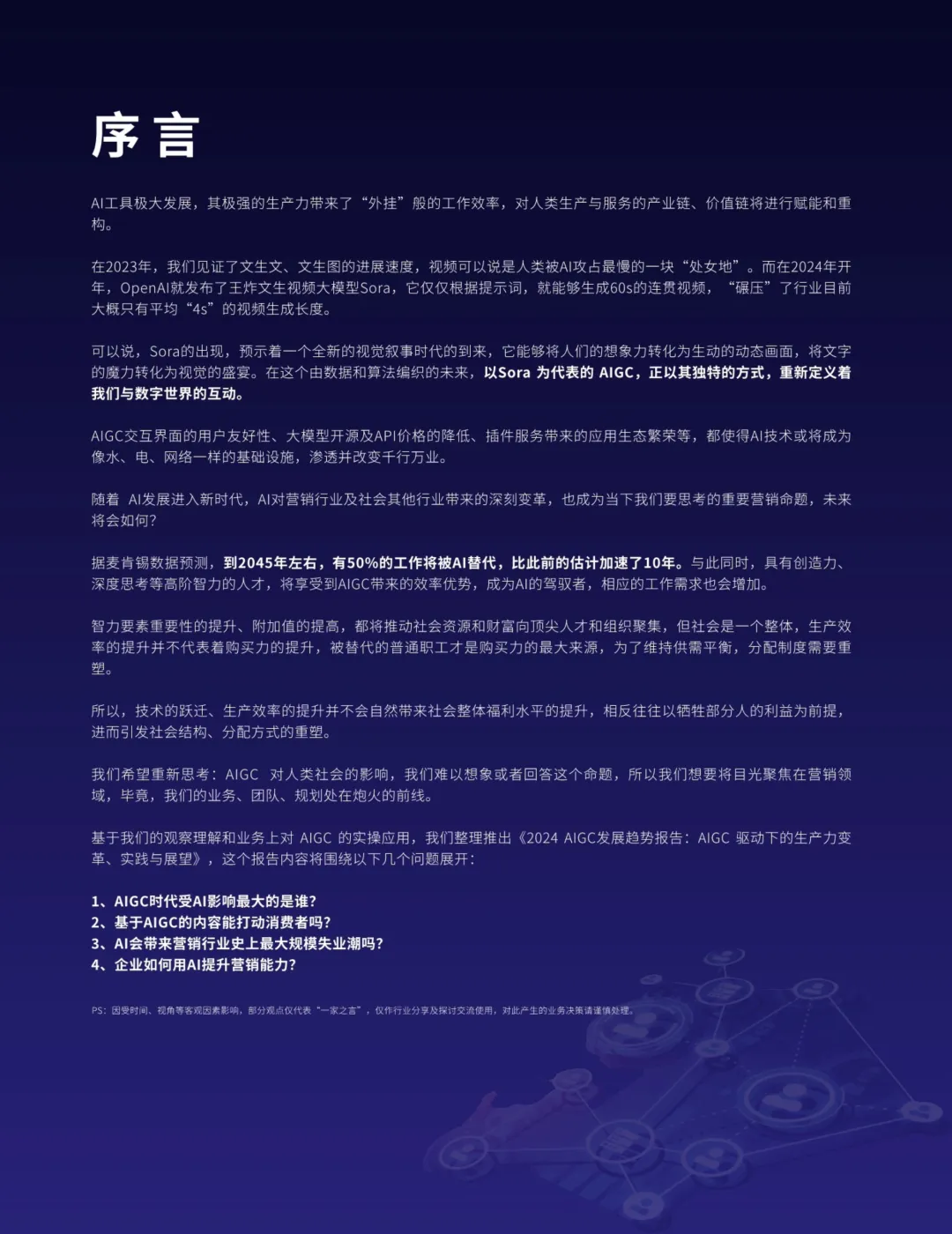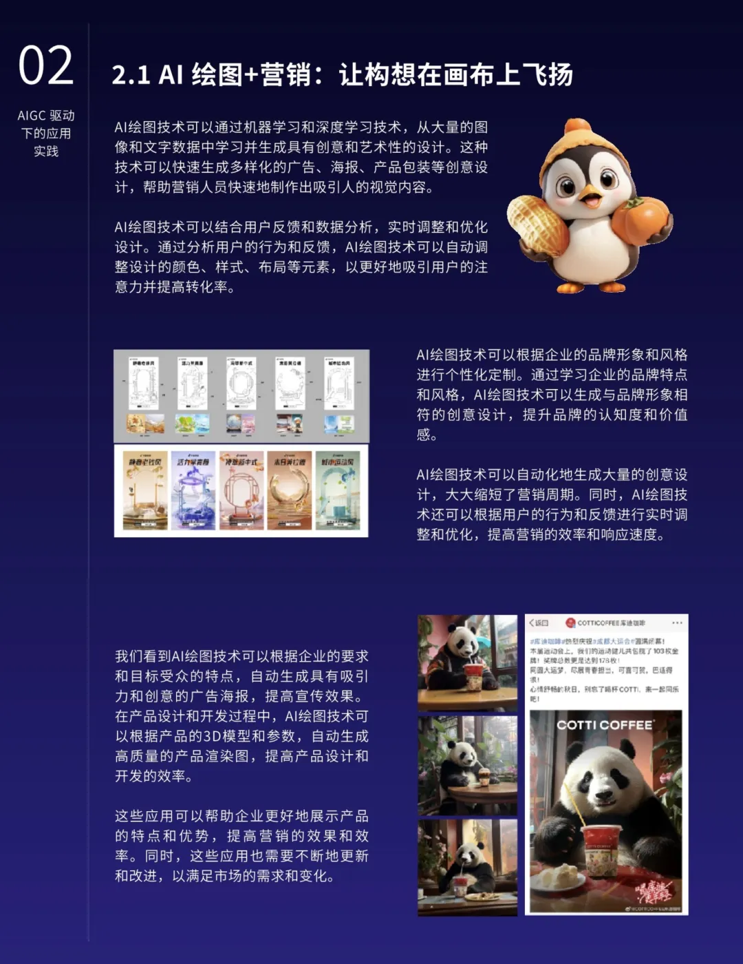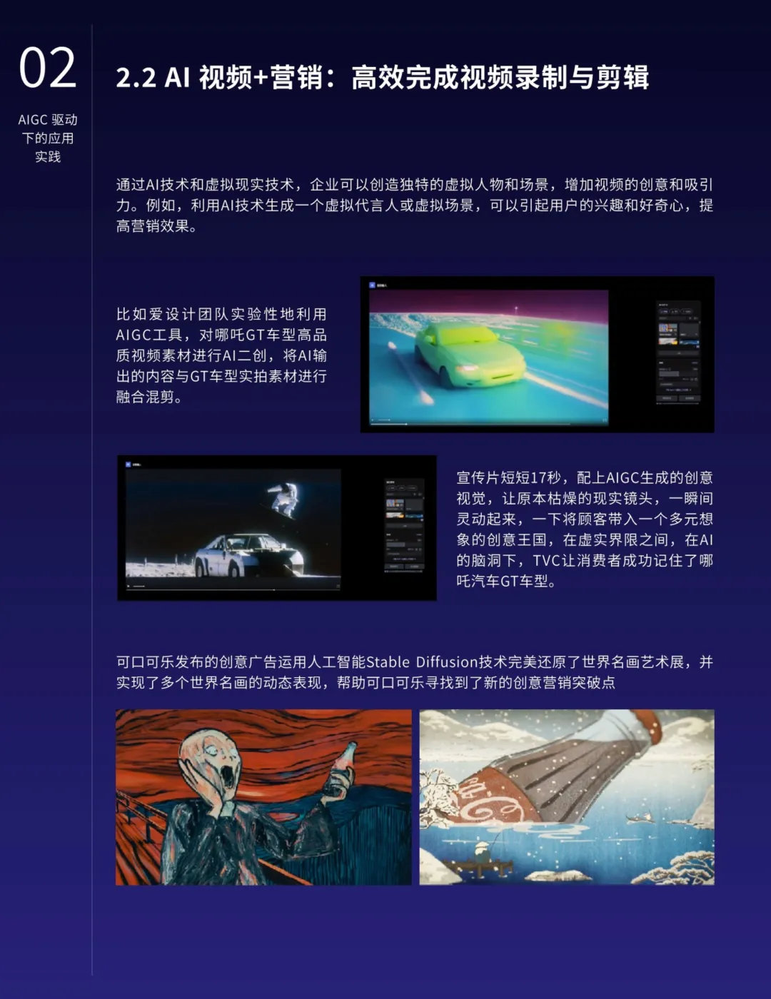 报告指出,AIGC技术的用户友好交互界面、大模型开源的便捷性、API价格的下降以及插件服务的繁荣,共同推动AI技术如同水电一样成为基础设施,渗入并革新各行各业。尤其在营销行业,AI绘图、视频与写作技术正在全方位提升营销效能。AI绘画技术能够根据需求瞬间创作出极具创意的艺术设计,大幅缩短设计周期;AI视频技术则可以高效完成视频录制与剪辑,精准定位受众需求,生成个性化视频内容;而AI写作则能在短时间内生成高质量文案,满足不同场景的营销需求,如社交媒体文案、产品介绍、新闻报道等。