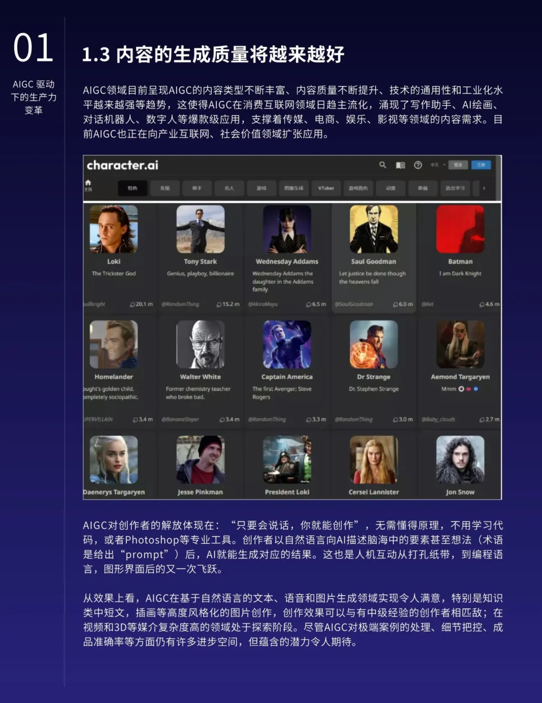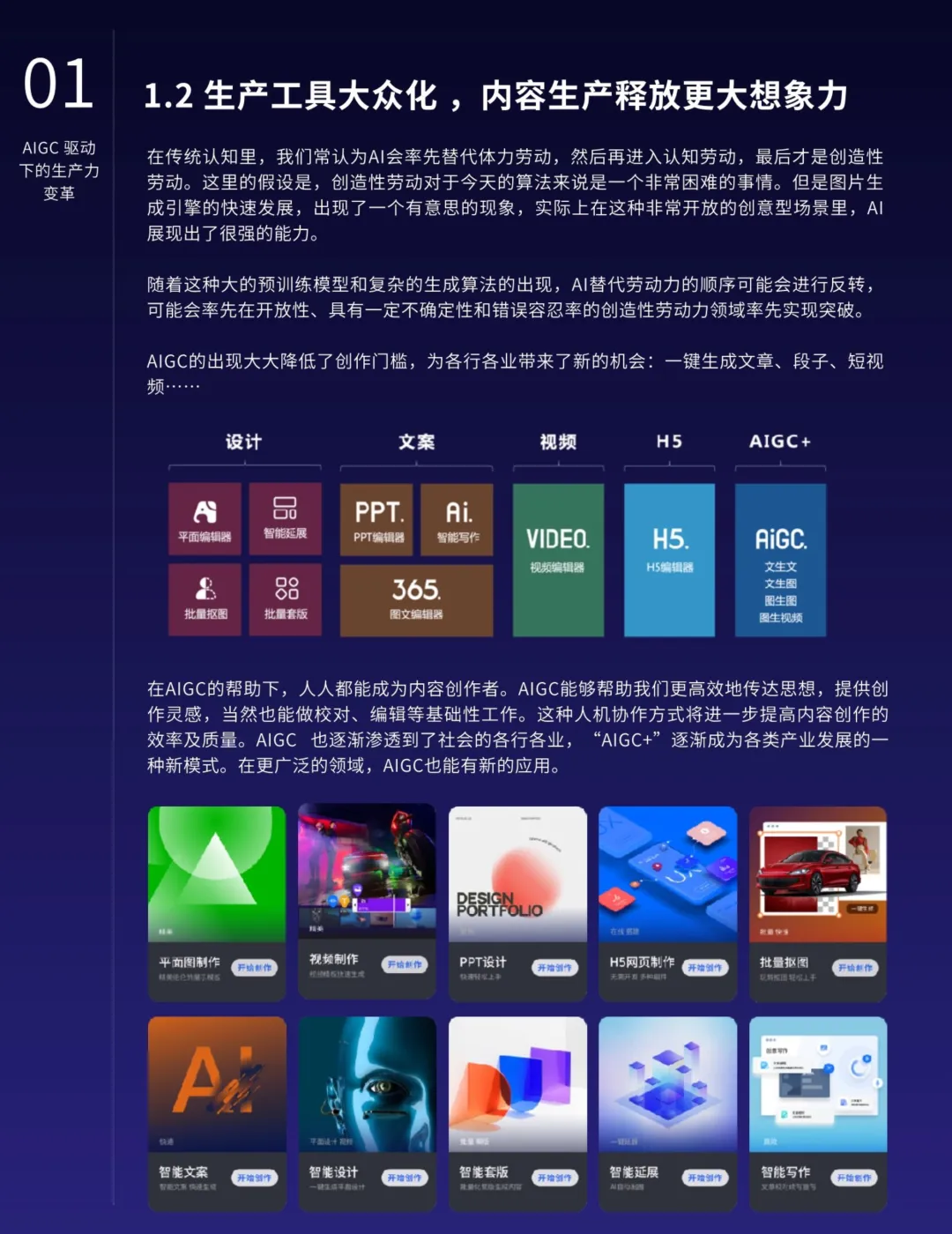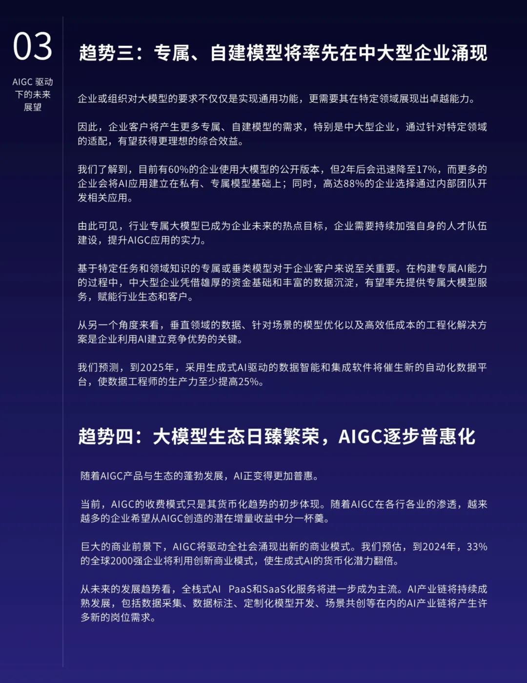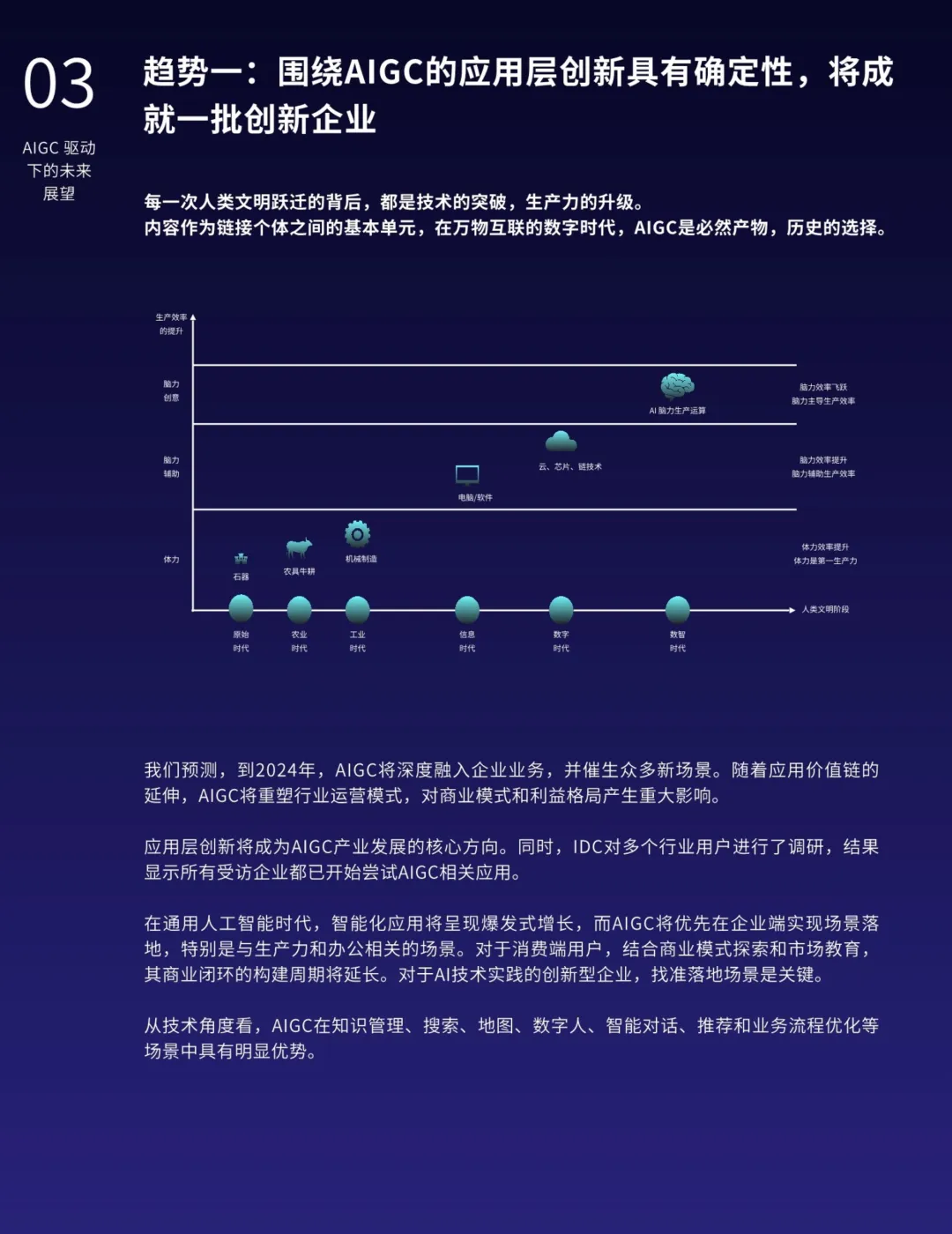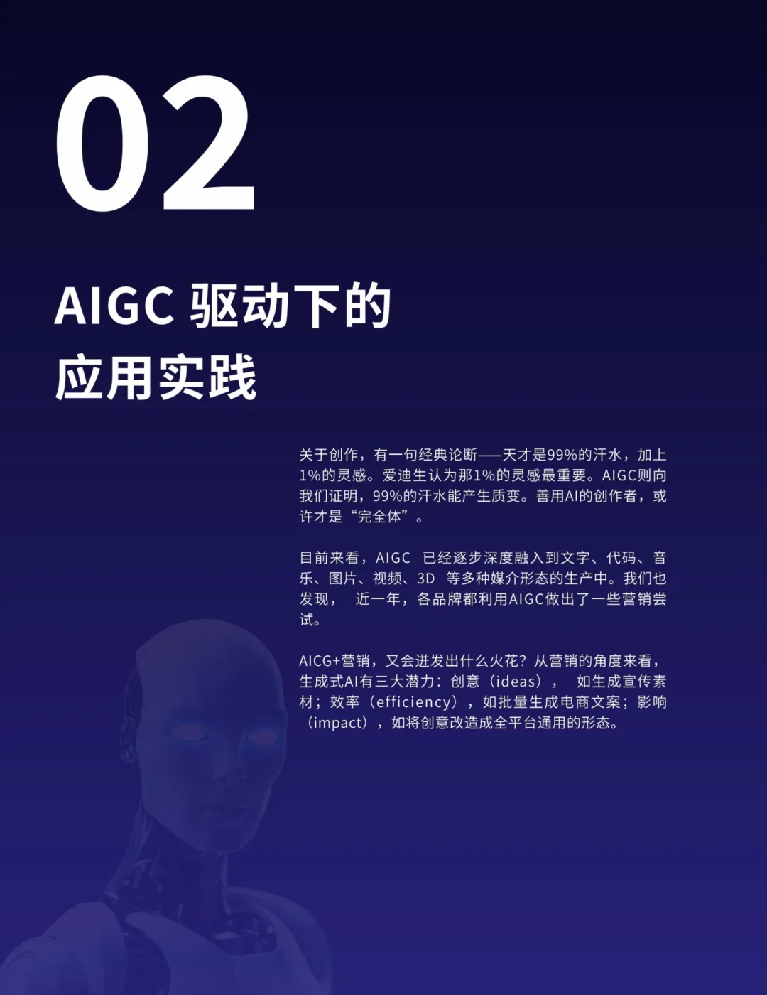 AIGC的应用不仅限于营销,还在各行各业中深化融合,提高生产力并催生新的业态。特别是在知识管理、搜索优化、地图导航、数字人技术、智能对话、推荐系统和业务流程等领域,AIGC展现出明显的优势。AIGC还将推动内容生产模式从PGC向AIGC的转型,释放更大的创作空间,提升内容质量的专业水准。