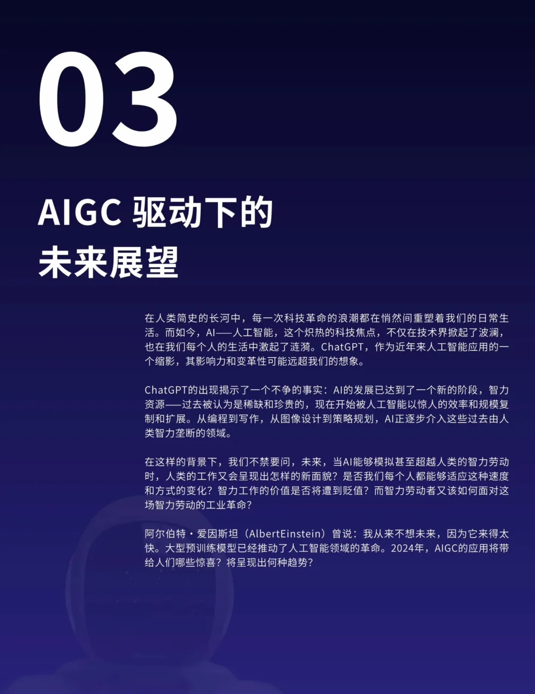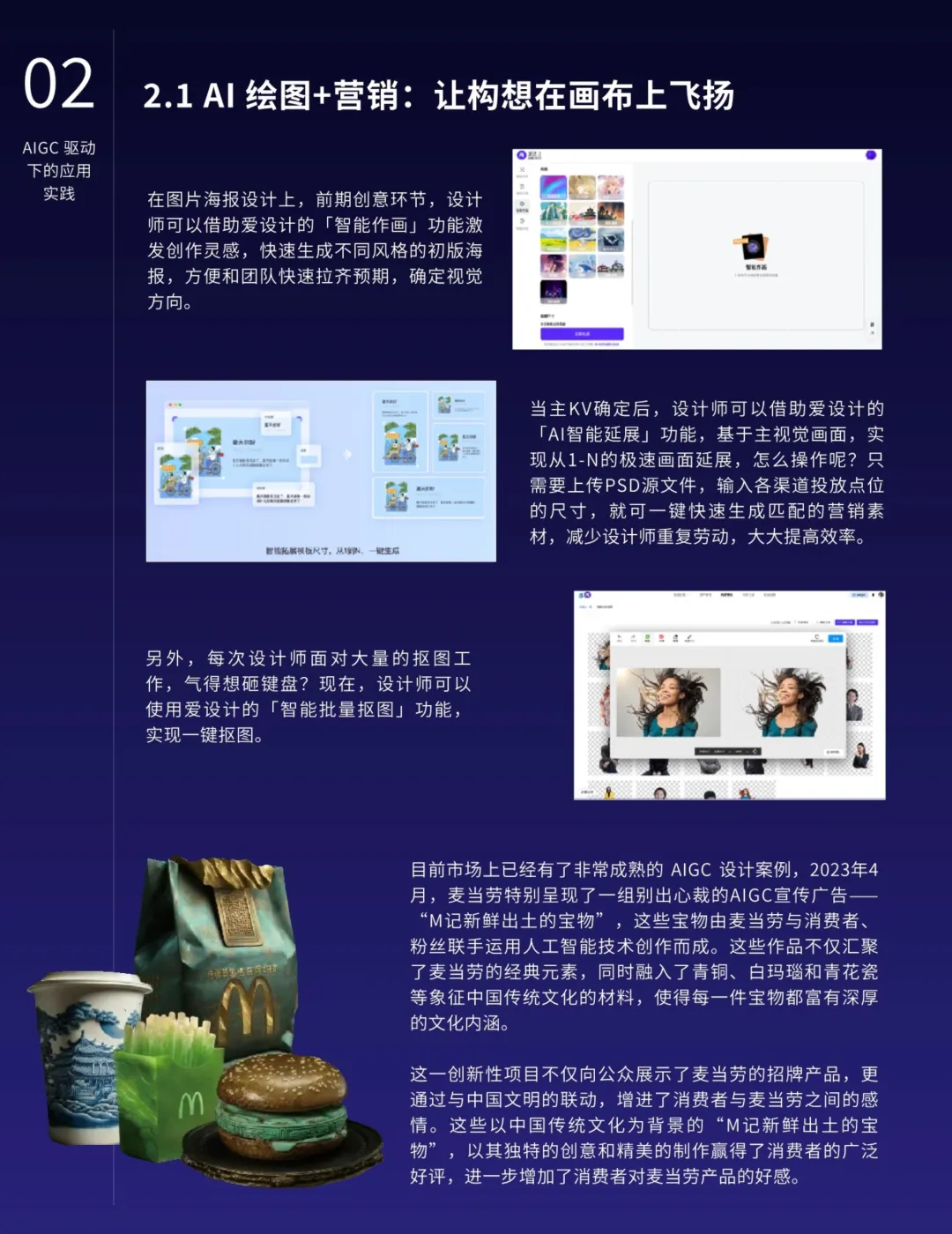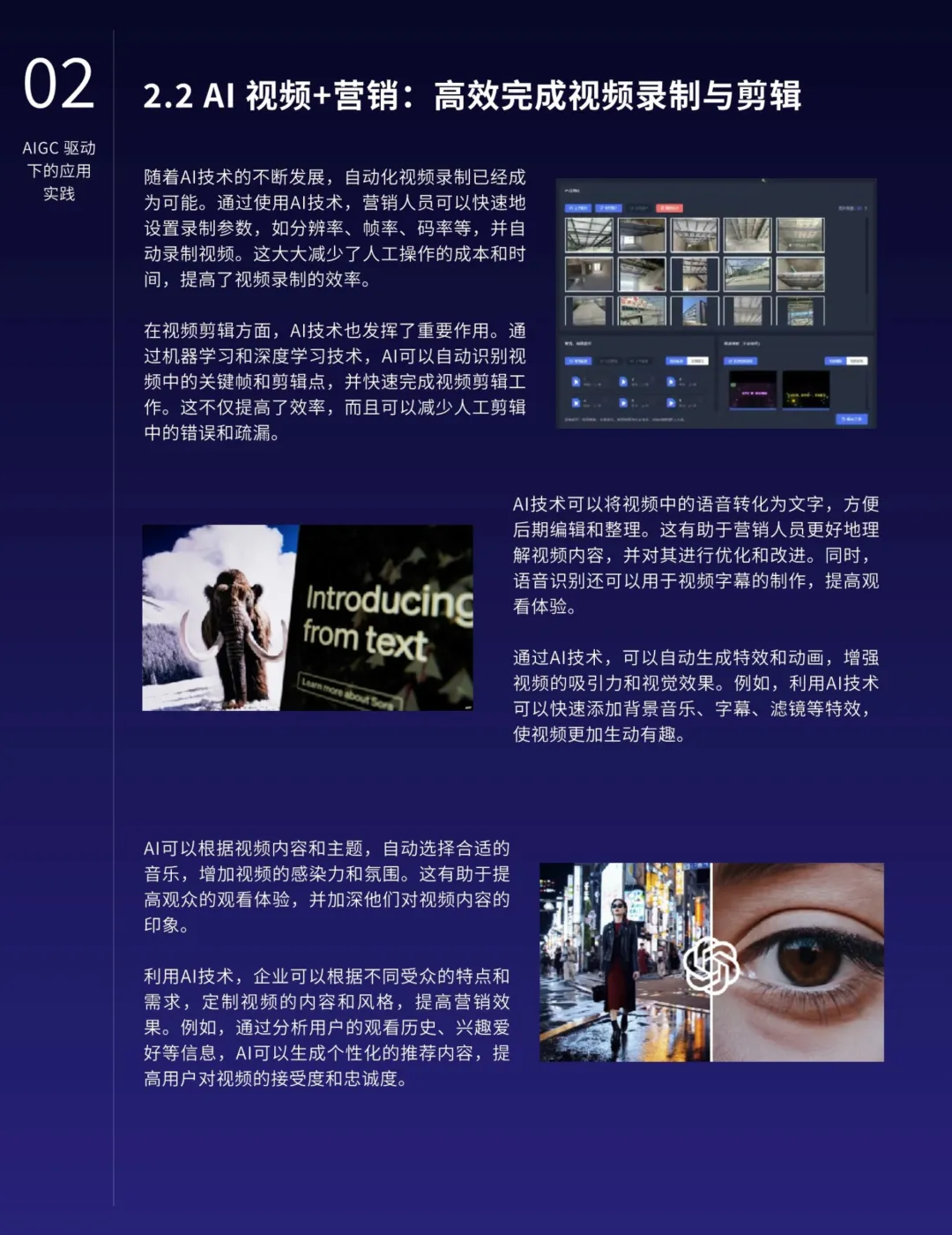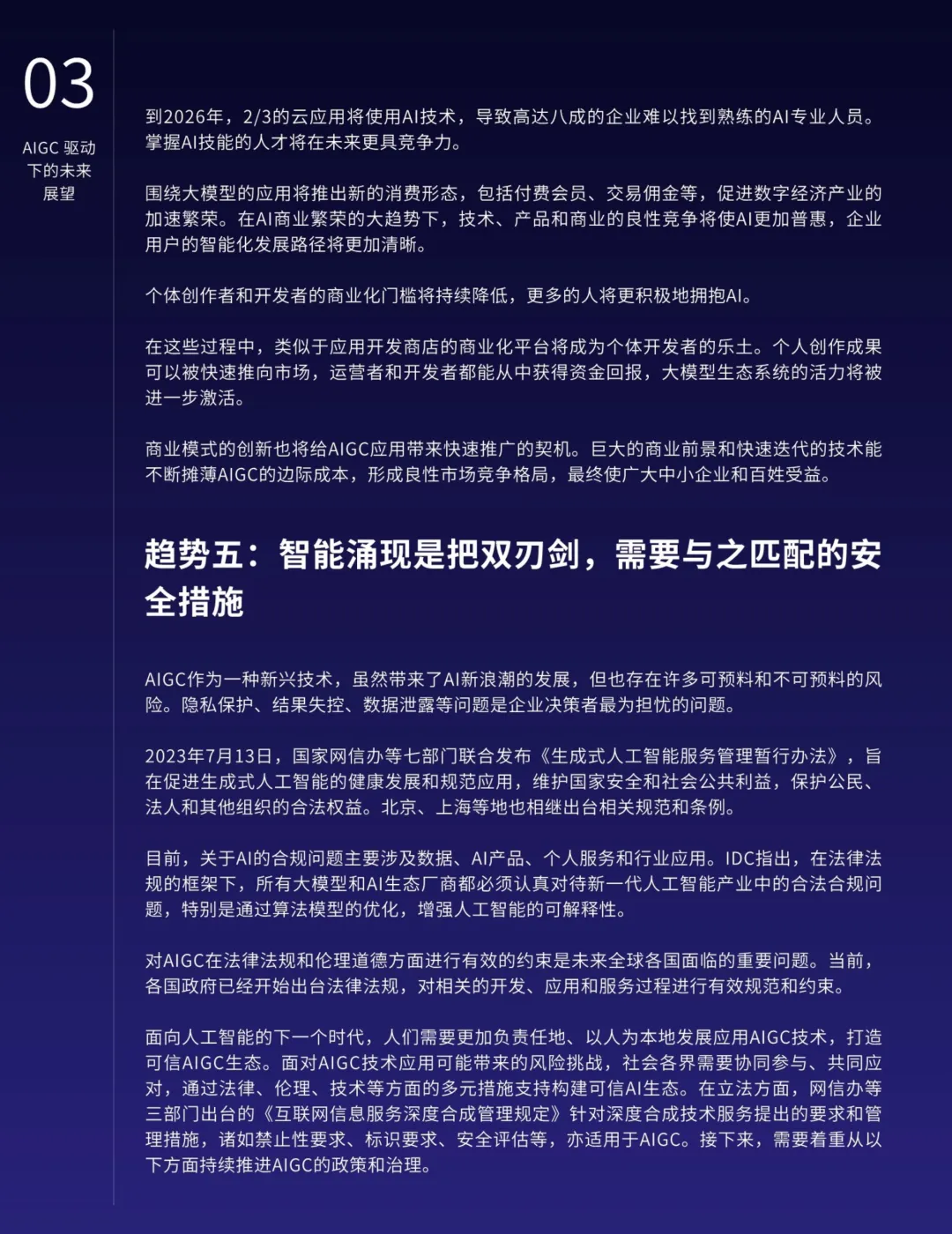 AIGC的应用不仅限于营销,还在各行各业中深化融合,提高生产力并催生新的业态。特别是在知识管理、搜索优化、地图导航、数字人技术、智能对话、推荐系统和业务流程等领域,AIGC展现出明显的优势。AIGC还将推动内容生产模式从PGC向AIGC的转型,释放更大的创作空间,提升内容质量的专业水准。