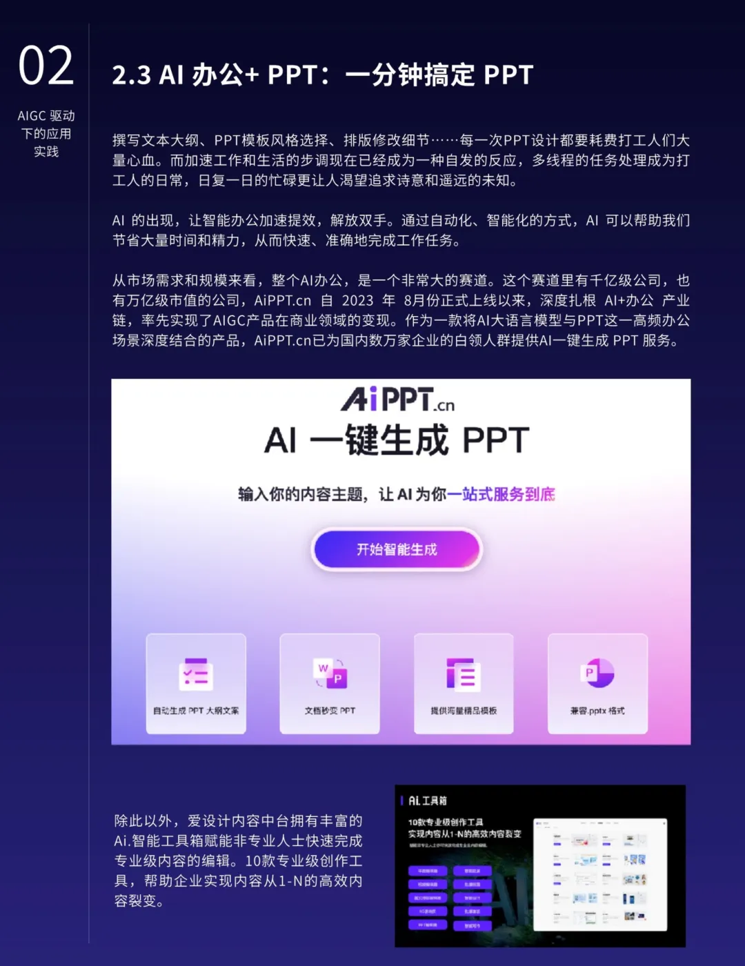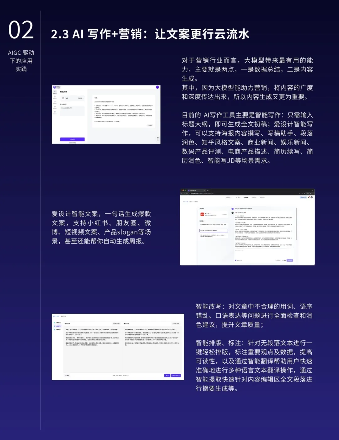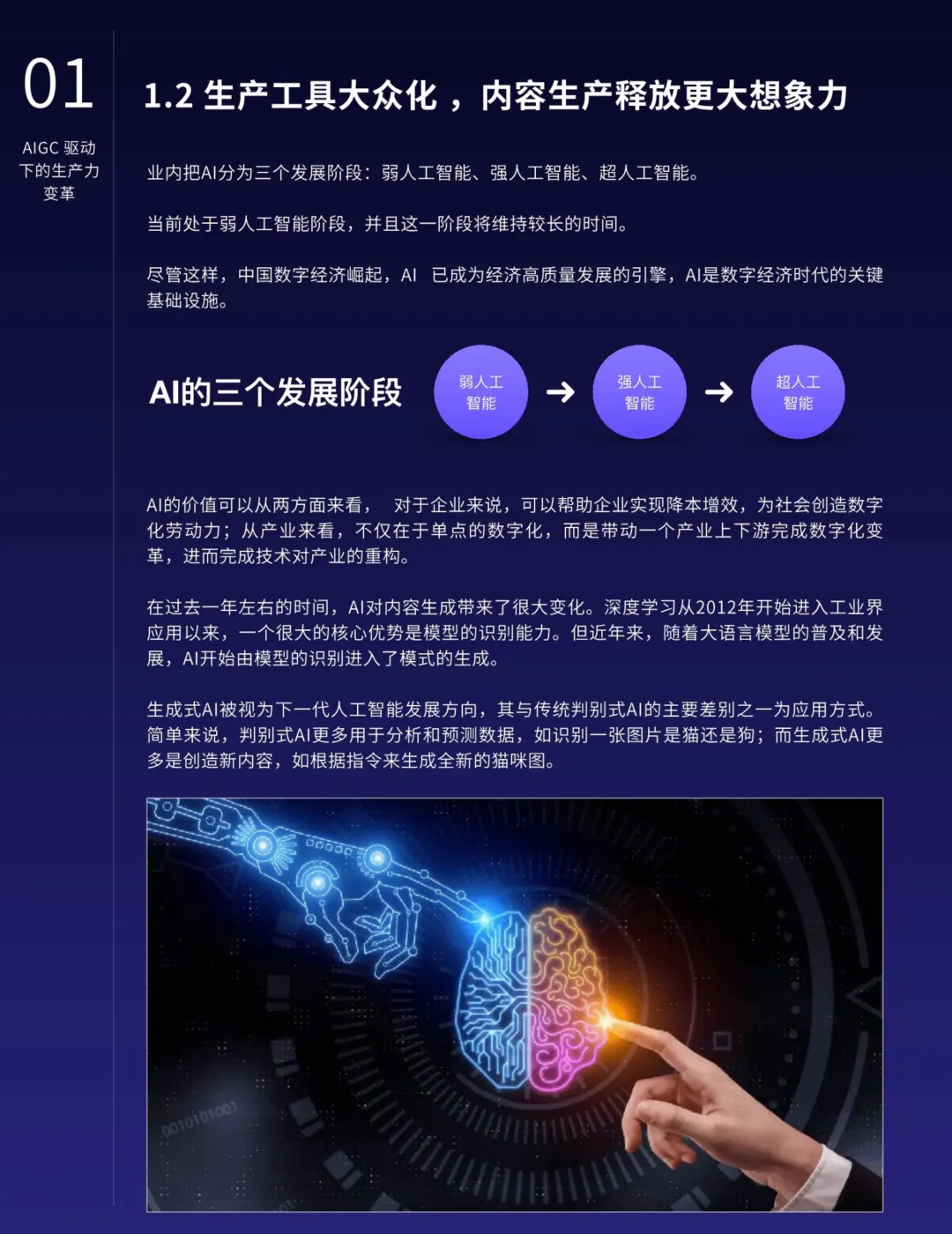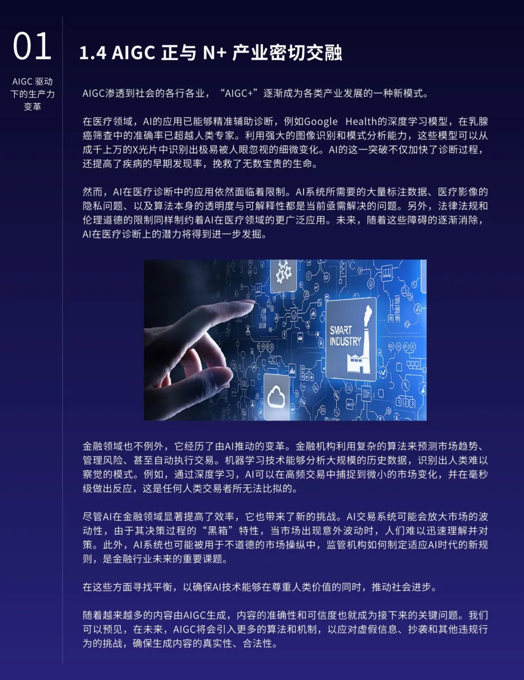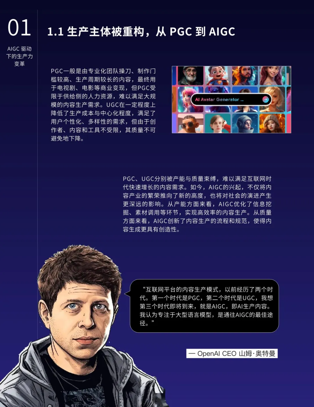 AIGC的应用不仅限于营销,还在各行各业中深化融合,提高生产力并催生新的业态。特别是在知识管理、搜索优化、地图导航、数字人技术、智能对话、推荐系统和业务流程等领域,AIGC展现出明显的优势。AIGC还将推动内容生产模式从PGC向AIGC的转型,释放更大的创作空间,提升内容质量的专业水准。