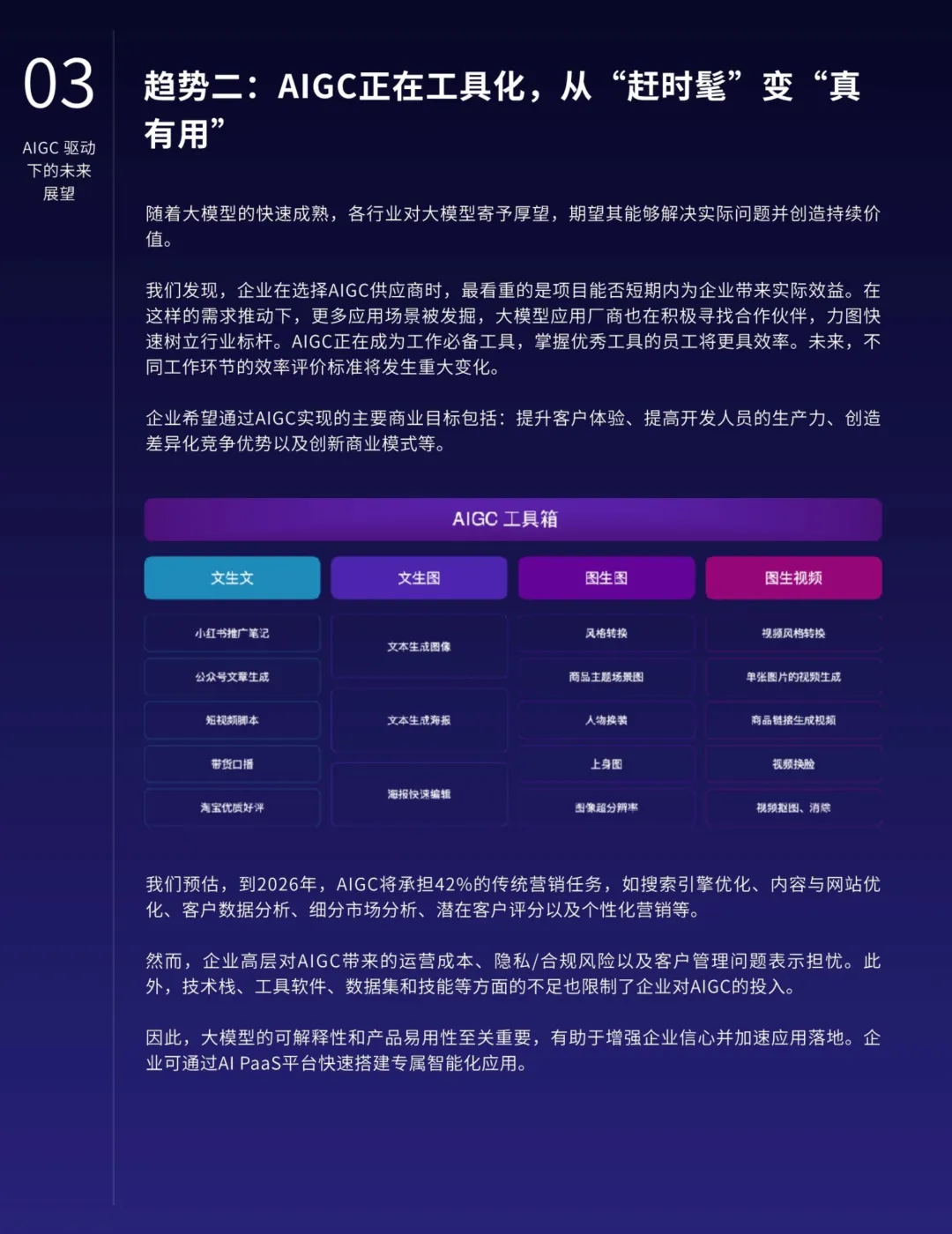 报告预计到2026年,AIGC将承担42%的传统营销任务,其中包括搜索引擎优化、内容优化、数据分析、市场细分等众多环节。另一方面,企业对AIGC带来的成本、隐私与合规风险持有警惕态度,技术的可解释性和易用性成为赢得企业信任的关键,促使各大公司通过AI PaaS平台构建专属智能应用。