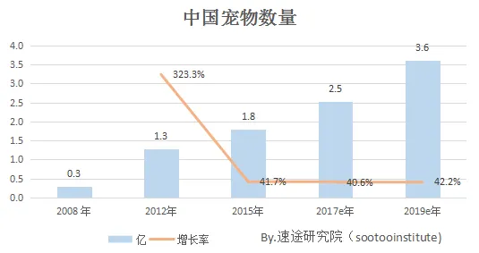 如今,宠物已逐渐成为大多数家庭重要组成成员之一,宠物的饲养量呈倍数增长,使宠物行业在近年来得到快速发展。据统计数据显示,2008年我国宠物数量仅有0.3亿只,而到了2012年,宠物数量激增至1.3亿只,增长率为323.3%;随着宠物热的持续,预计2017年宠物数量将达到2.5亿只,而到了2019年这一数字将以42.2%的增长率增长至3.6亿只。