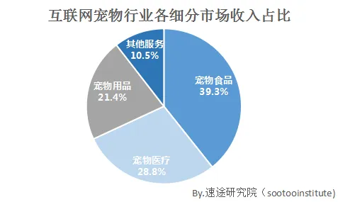 互联网宠物行业各细分市场收入占比方面,宠物食品占比39.3%;近年来逐渐受到重视的宠物医疗收入也较高,占比28.8%;宠物用品占比21.4%,其他附加宠物服务收入占比为10.5%。随着人们对于宠物消费的认知由基础生活层面转向更深层次的消费时,宠物用品和服务日益丰富。然而行业鱼目混杂,以次充好,致使宠物用品及服务质量层次不齐,规范尚未形成。
