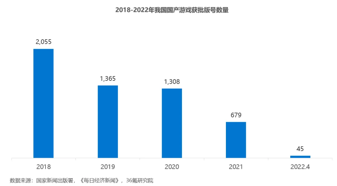 国家新闻出版署、国家广播电视总局等陆续出台系列政策,从游戏服务时长、实名登录和规范付费等多方面,限制未成年人的游戏时长和付费情况,进一步落实网络游戏防沉迷管理措施。国家新闻出版署数据显示,从2018年到2022年4月,国产游戏获批版号数量大幅减少,获批数量从2,055个降低至45个。