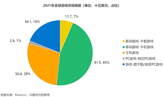 疫情推动全球游戏用户习惯向移动端转变的同时,移动游戏优质化发展和其社交属性促使用户粘性提升,全球移动游戏市场规模持续扩大,为我国游戏厂商进军海外市场厚植优良的发展环境。据Newzoo数据,2021年全球游戏市场规模中,移动游戏占比最大,超过50%,且仅有其保持正增长,同比上涨7.3%,游戏移动化趋势明显。