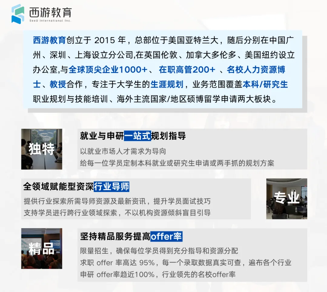 西游教育,作为行业内首批从业者,专注于大学生的生涯规划,业务范围覆盖本科 / 研究生职业规划与技能培训、海外主流国家/地区硕博留学申请。