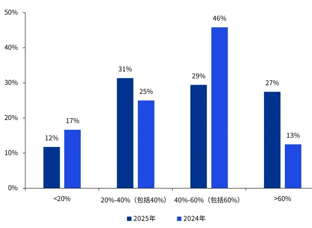 从榜单企业技术人员分布看,2025年近六成上榜企业的技术人员占比超过40%。其中,技术人员占比大于60%的企业达到27%,较去年大幅提升15个百分点(图4)。