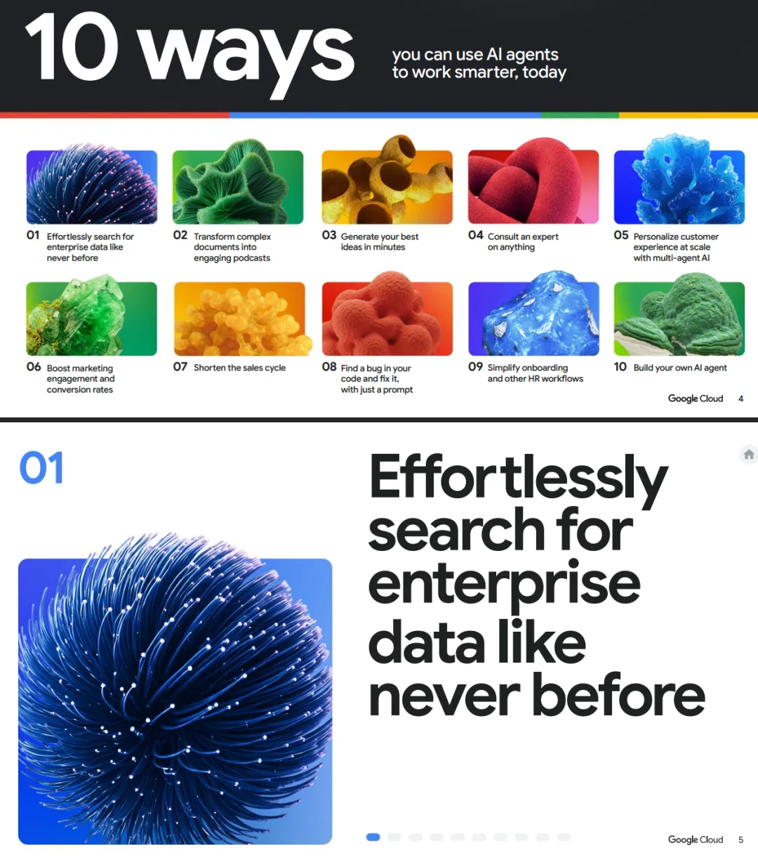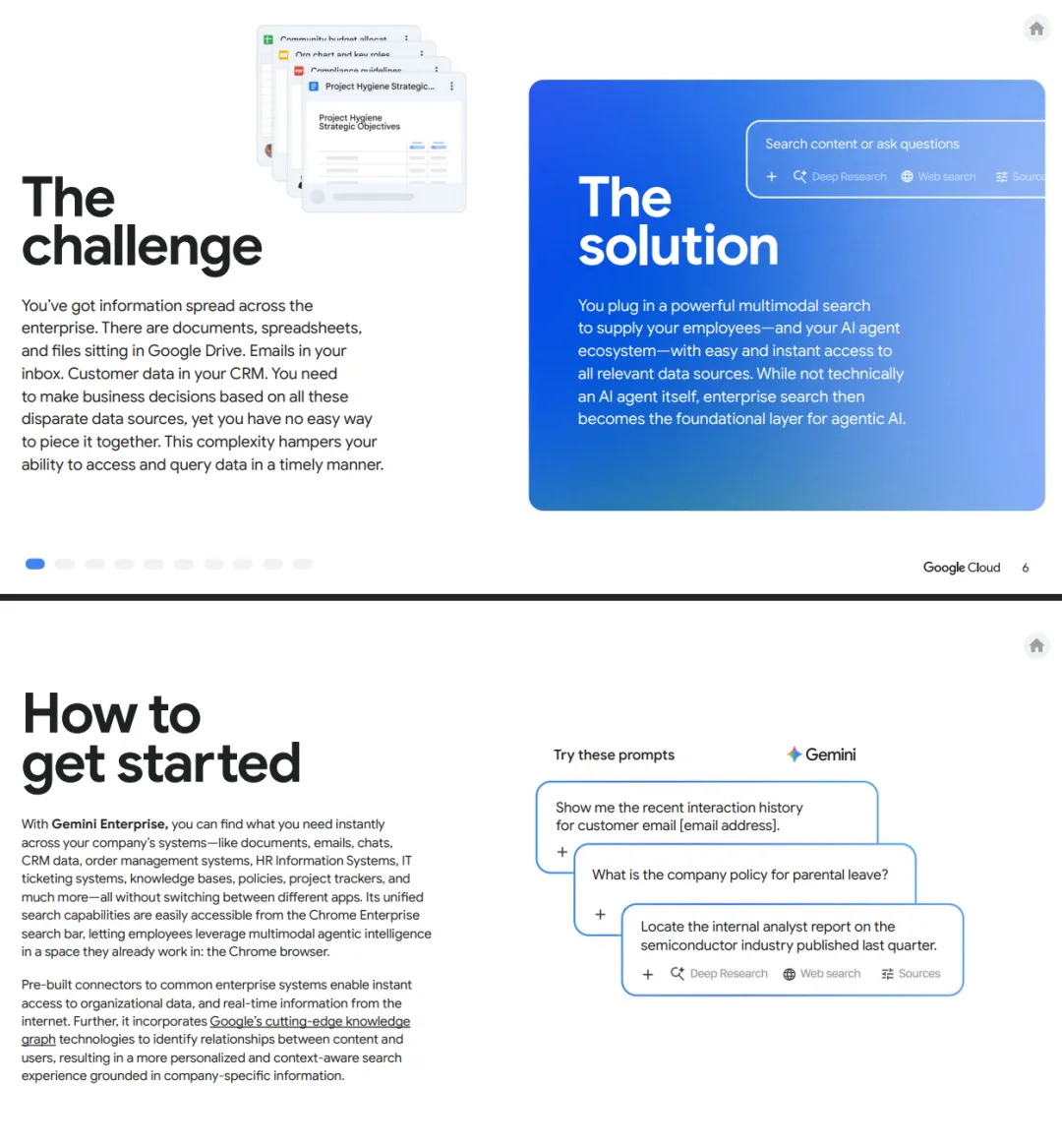 企业数据智能搜索:通过统一的多模态搜索(如Gemini Enterprise),员工可瞬时跨文档、邮件、CRM等系统获取信息,无需切换应用,奠定智能体AI的数据基础。