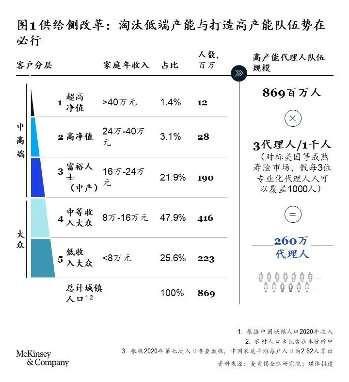 中国寿险市场结构性错配问题凸显。2021年,中国寿险市场保费规模达人民币3.1万亿元。虽然2015-2020年间整体市场规模每年保持着15%的高速增长,但2021年保费规模自2012年以来首次下降【1】。我们认为其根因在于过往“大进大出”粗放式增员的大众代理人发展模式造成供需结构性错配,并且其后果日益凸显。在需求端,我们看到,以高额保障、高端医疗养老和财富规划为代表的中高端客户需求持续提升,并在2022年“开门红”期间大单频出;而与之相对,在疫情反复和经济环境不确定情况下,大众客户保险消费需求下降明显。而在供给端能够匹配中高端客层、满足其需求的中高端代理人队伍明显不足;低产能大众代理人队伍与所属机构面临获客难与出单难等生存危机,出现产能过剩。