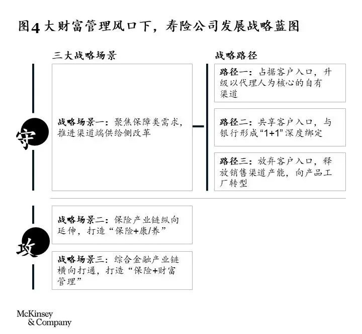 “防守”战略即聚焦保障类需求,深化供给侧改革,以更好满足持续增长的中高端客户保障类需求。寿险公司可根据对客户入口的掌控度(即占据、共享或放弃),来选择相应战略路径,如升级代理人队伍、强化银保渠道,或者退而转型成为产品工厂。