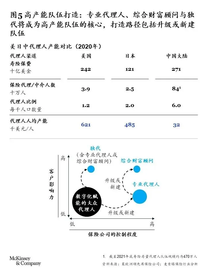 回顾美国、日本及其它亚洲成熟市场寿险代理人渠道发展历程,我们可发现,它们都经历了从“人海战术”为主的粗放式扩张,到低端产能出清以及向代理人专业化转型的过程。代理人渠道专业化转型,不仅使消费者获益,也能提升寿险公司产能与业绩。以美国市场为例,某北美领先人寿保险公司自2008年起改革代理人渠道,包括在全国吸纳6000多名人才,得益于改革举措,该公司在短短10年取得超过市场平均水平4倍的发展速度【4】。