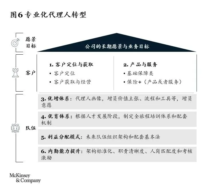 基于行业实践经验,我们建议寿险公司可从客户、产品与服务、优增体系、优育体系、利益分配模式、内勤能力提升六大维度,设计和推进代理人队伍专业化转型路径(见图6)。