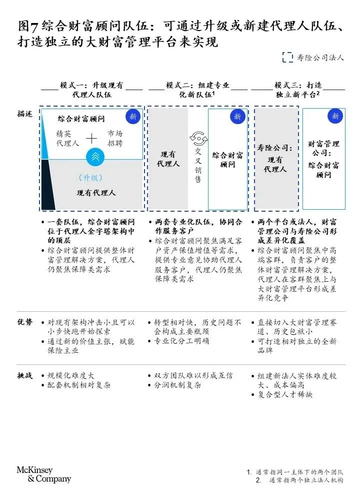 寿险企业可以通过升级现有代理人队伍、新建代理人队伍,或者打造独立大财富管理平台等方式打造综合财富顾问队伍。当然,上述不同模式各有利弊,寿险公司需根据自身情况选择,甚至有机结合、同步探索不同模式(见图7)。