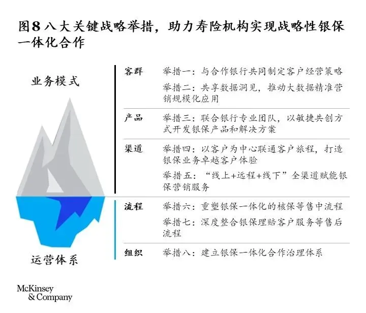 我们建议寿险公司积极采取“八大战略举措”,即从协同客户经营、规模化精准营销、产品定制及共创、极致客户旅程、全渠道赋能、重塑核保流程、整合售后服务流程、一体化治理体系八大方面,多措并举,全面推动银保业务高质量转型(见图8,更多内容请参考麦肯锡2021年发布的保险行业白皮书《破解迷思,探索高质量银保发展新模式》)。