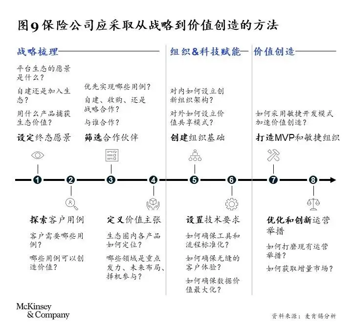 寿险公司在打造“保险+康/养”生态圈时,需要自上而下进行战略规划,充分调动平台组织和技术赋能,最终激发各生态业务主动创造价值。我们根据国内外成功生态玩家的经验,总结出打造垂直生态圈的八大步骤(见图9)。