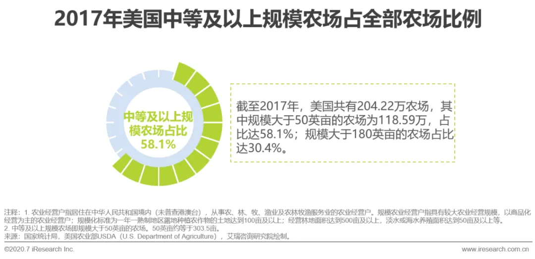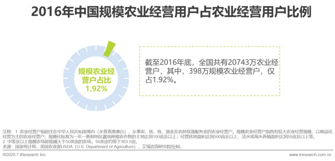 根据第三次全国农业普查报告,截至2016年底,全国共有20743万农业经营户,其中,398万规模农业经营户,仅占1.92%。而从美国农业部数据来看,2017年规模大于50英亩的农场占全部农场的比例达58.1%。相对来说,我国仍旧以分散的小规模经营户为主,规模化的农业生产基地占比较少,与发达国家还有一定的差距。但随着农民合作社、家庭农场等新型农业经营主体的发展以及农业现代化水平的提高,生鲜农产品生产规模化、标准化、科技化、集约化、产业化程度正在逐步提升。