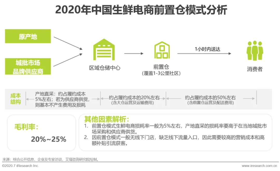 现如今,生鲜电商行业已进入更追求配送效率的生鲜到家时代,前置仓模式生鲜电商将商品前置到距离消费者更近的场景,提高了物流配送效率及体验,进而受到了资本市场的广泛关注。相对来说,前置仓模式属于资金密度型投入,是重资产、重运营的模式。从前置仓模式生鲜电商履约成本构成来看,大仓到前置仓以及最后一公里仓配成本较高。此外,前置仓模式一般无线下门店,缺乏线下流量入口,需要较高的营销成本和高额补贴来引流获客,总体来看,前置仓模式需要高昂的成本投入和较长的回报周期。当下,前置仓模式还在不断地发展和迭代中,能否实现成本端与收入端的平衡,找到盈利方式,从而获取正向的现金流,是前置仓模式能否成功跑通的关键。