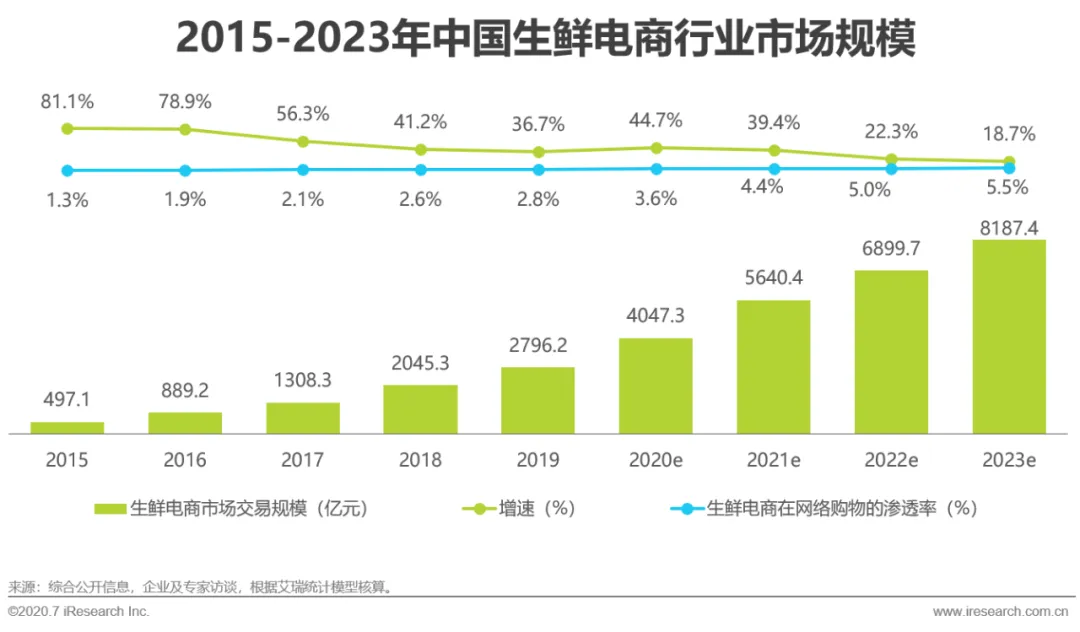 2019年中国生鲜电商行业市场交易规模达2796.2亿元,较上一年增长36.7%。2020年受疫情影响,消费者对于生鲜到家的需求急速增长,生鲜电商市场交易规模将会有显著的提升,预计到2023年,生鲜电商市场交易规模将超过8000亿元。
