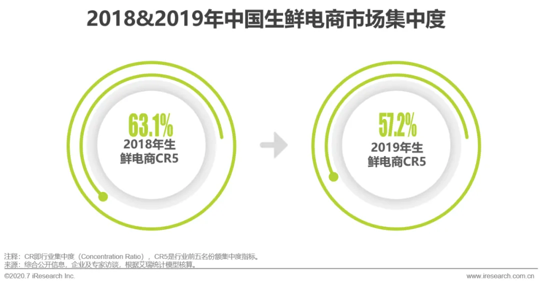 生鲜电商市场集中度较高,2019年生鲜电商行业前5家企业份额占比为57.2%。相对于2018年来说,2019年行业TOP5份额有所下降,原因在于当下生鲜电商市场玩家众多,除综合生鲜电商平台外,多个新型商业模式玩家规模增长较快,在整体市场中崭露头角,涌现了一些“明星生鲜电商企业”,而这些企业瓜分了一部分市场份额。