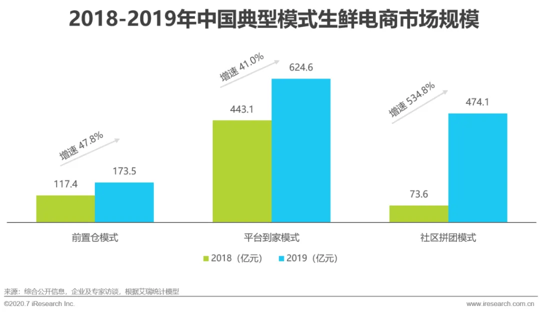 聚焦于规模而言,2019年,前置仓模式及平台到家模式生鲜电商交易规模增速均超过了40.0%,高于生鲜电商平均增速;社区拼团模式生鲜电商综合成本低、有流量红利等特点吸引了众多资本和玩家的青睐,自2018年下半年开始爆发式增长,2019年交易规模为474.7亿元,增速达534.8%。总体来说,前置仓、平台到家、社区拼团三类模式生鲜电商各有优劣,近年来发展较快,每个模式中的代表企业近年来均展现出不错的发展势头。