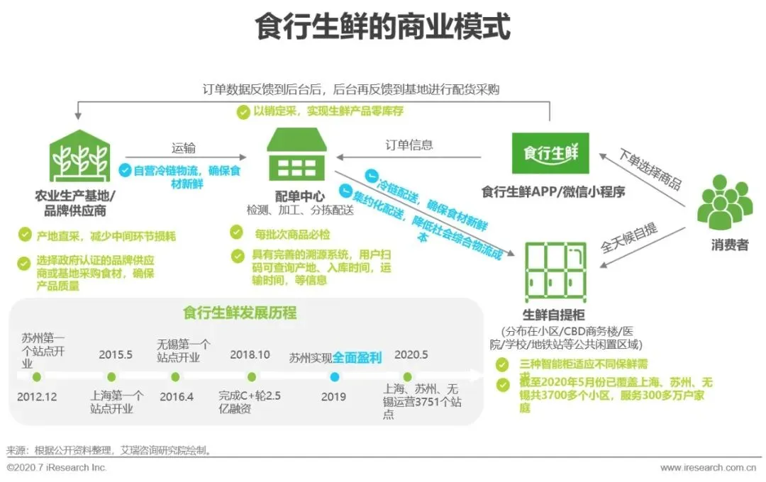 食行生鲜成立于2012年,从苏州起家,深耕华东市场,首创“预订制+ 全程冷链+冷柜自提”的运营模式,通过反向定制、以销定采和订单式采购实现零库存,同时通过大规模的基地直采和集约化的冷链配送,直接连通农产品生产基地与消费者,降低损耗和配送成本。