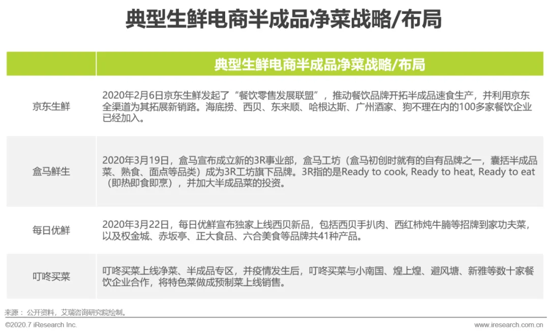 疫情期间,半成品市场加速发展,半成品菜+线上销售打开了餐饮新零售的局面,众多餐饮企业推出半成品菜的同时,一些主流生鲜电商平台也开始对半成品市场进行拓展部署。