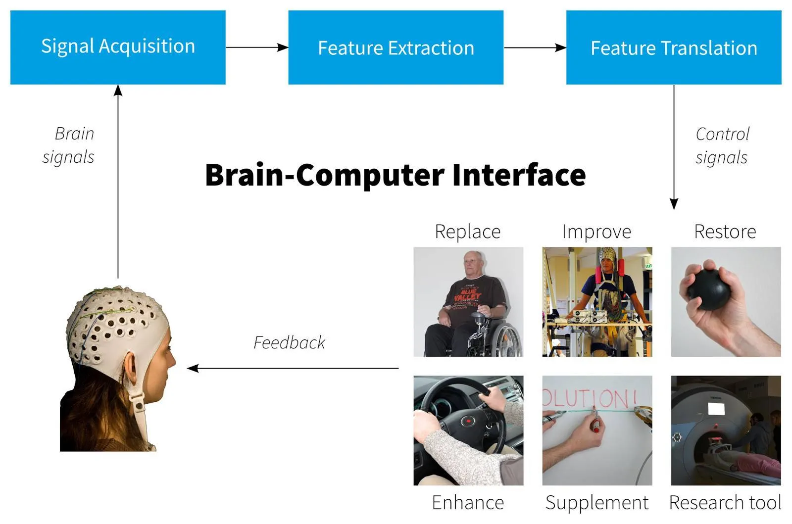 典型的系统有脑电图(EGG),脑电图是有潜力的非侵入式脑机接口的主要信息分析技术之一,这主要是因为该技术良好的时间分辨率、易用性、便携性和相对低廉的价格。