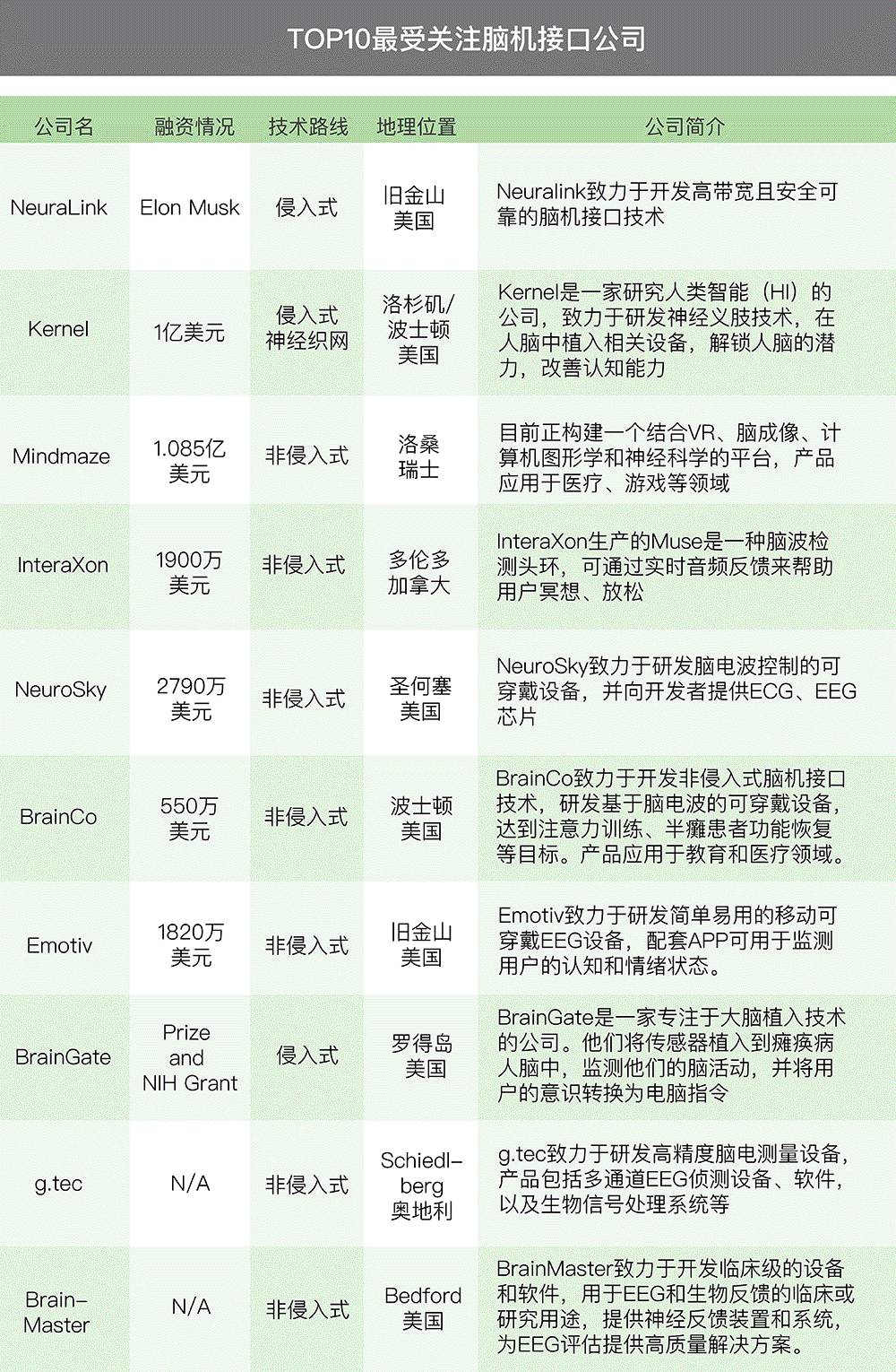 根据公司技术、团队/合作伙伴、发展计划、产品、融资情况这五个维度,评出了世界十家值得关注的脑机接口公司。
