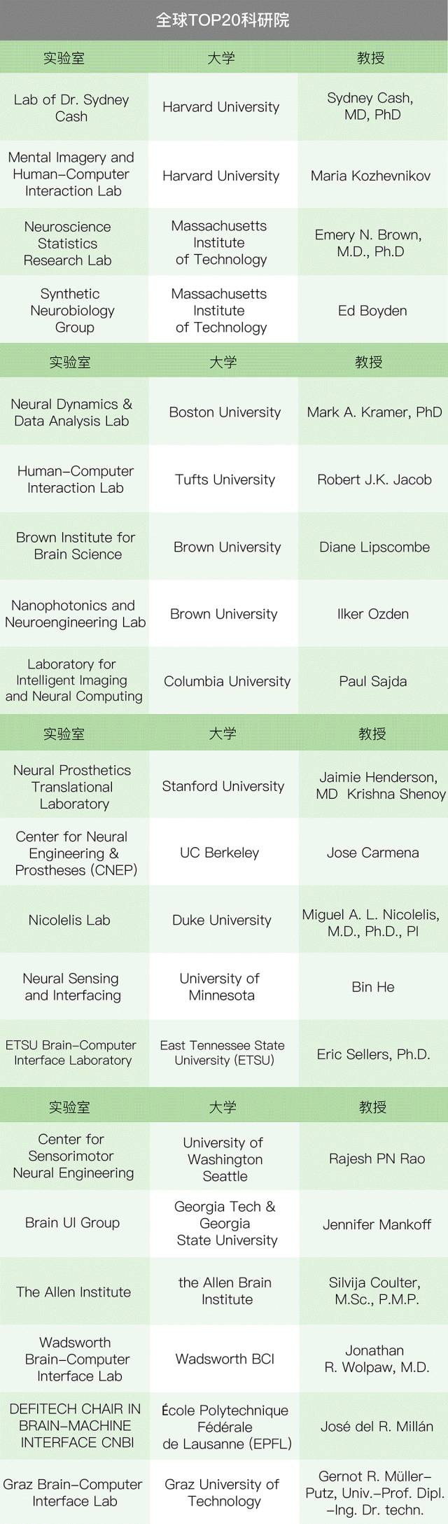 当然,除了这20大科研院所外,还有美国国防高级研究计划局 DARPA 及 Facebook的 Building 8 等神秘课题组在从事脑机接口方面的研究。
