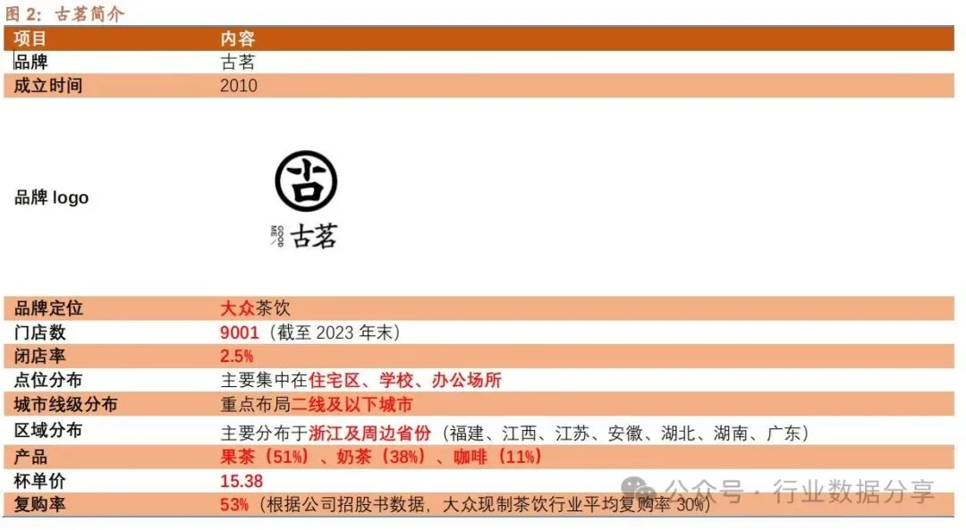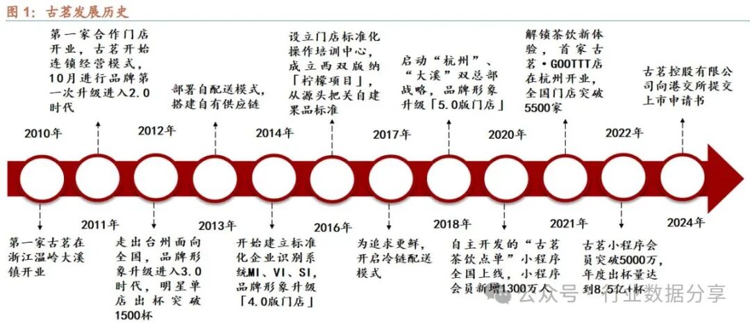 古茗是行业领先的大众现制茶饮品牌,致力于提供新鲜美味、价格亲民的茶饮产品。古茗品牌创立于浙江,成立至今,古茗进行过数次品牌形象升级,依靠强大的自建供应链和加盟招商体系,古茗于 2023 年底门店数量突破 9000 家,2023 年全年实现 GMV 192 亿元。
