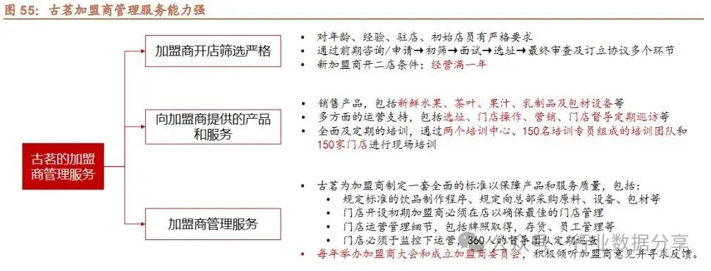 古茗采用地域加密开店策略,以浙江为中心向外拓张。古茗为加盟商提供了全方位的支持和服务。从选址、装修到员工培训、市场推广,古茗都有一套成熟的标准操作流程,确保每个加盟店都能顺利开业并取得成功。此外,古茗还定期举办加盟商培训活动,帮助加盟商提升经营管理能力,实现可持续发展。2023 年古茗加盟商单店经营利润达 37.6 万元,单店经营利润率达 20.2%,为加盟商带来可观的收入。在供应链管理上,古茗茶饮以实验室建设、供应链管理能力的加强等策略持续优化他们的供应链。从自建生产基地、加强供应链管理能力、建设专项的实验室,一步一步走向了完全独立状态,用循序渐进来形容古茗的状态尤为贴切。密集的门店网络大幅提高公司仓储物流效率和成本效益。不断筛选加盟商及完备的供应链服务,这样的商业模式不仅让古茗品牌在市场中保持领先地位,也为加盟商带来了丰厚的回报。实现品牌和加盟共赢的模式,许多加盟商在加盟古茗后,实现了事业的快速发展和财富的积累。