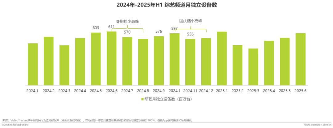 综艺市场整体处于相对稳定的发展阶段,每月月独立设备数达到5-6亿的活跃量级。受益于暑期档学生用户的涌入、热门节目排播和高温宅家需求的旺盛,2024年6月月活设备量级达到全年峰值;受国庆假期集中效应和开学季后年轻用户放松需求的影响,10月综艺市场表现再次回升。