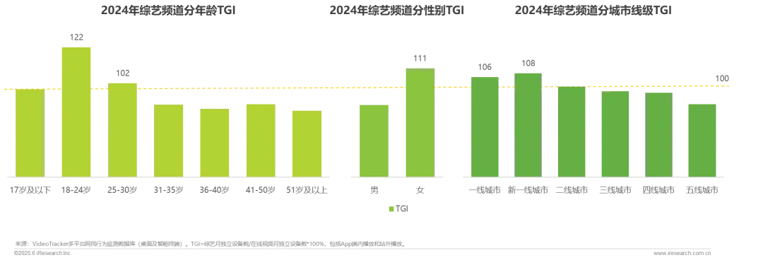 相比于在线视频全站用户,综艺频道在18-24岁年轻群体中最受欢迎,其TGI指数高达122,远超其他年龄段。女性观众偏好度(TGI=111)明显高于男性观众。观众偏好更集中于高线城市,尤其在新一线城市和一线城市。