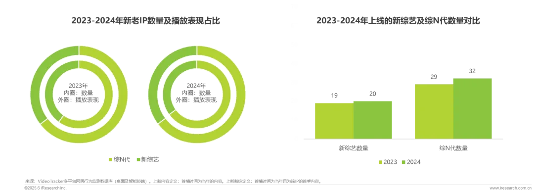 2024年上线的新综及综N代均呈现增长态势。一方面,平台对于内容创新方面保持良好信心,积极稳定投入新内容的研发,2024年涌现新综艺20部,较2023年增加1部,且播放份额较之2023年有明显提升,成功抓住用户注意力。另一方面,既有的综艺IP受到了市场认可,各平台延续制作综N代的意愿明显提升,2024年综N代共计32部,较2023年增加3部,内容IP影响力持续增长。