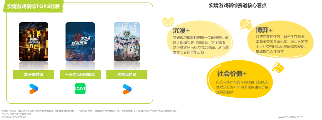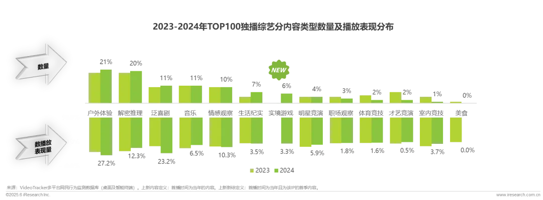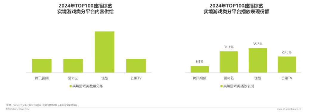 2024年“户外+”“游戏+” 元素保持较高热度,类型融合促进新赛道的形成,各平台均布局户外游戏探索内容;其中优酷发力显著,年内共计上线3部实境游戏类综艺,播放份额位列第一,赛道内播放贡献占比35.5%。