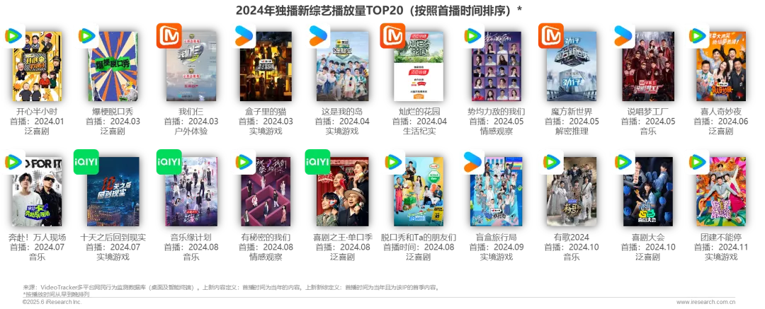 2024年上线的新综艺题材丰富多元,包含实境游戏、泛喜剧、户外体验、生活纪实、情感观察、解谜推理等各种型态。从播出时间来看,第二和第三季度是热门新综艺的重要首播窗口期。