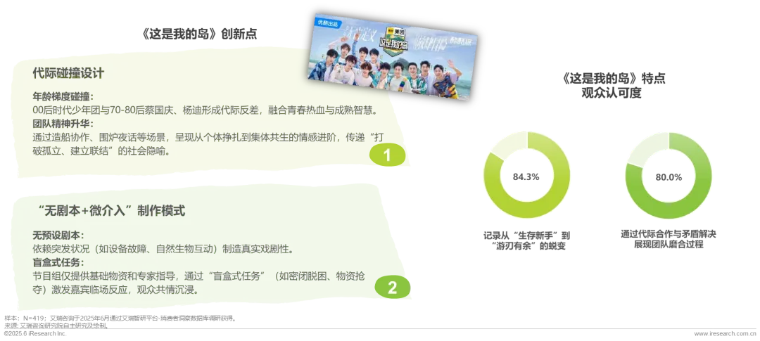 在2024年热门品类实境游戏登榜的新综——《这是我的岛》,首季以荒岛生存实景体验切入,通过“无剧本+高强度挑战”模式建立差异化,成为优酷2024首档热度破万综艺,热度持续发酵,荣登优酷热度日冠42天。