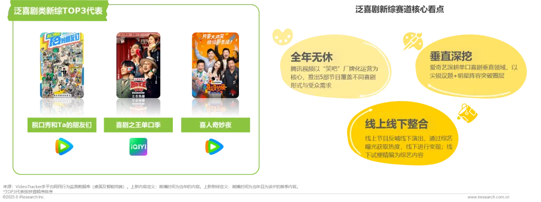 2024年喜剧综艺赛道呈现“双雄争霸”格局,腾讯视频通过「笑吧」排播带集中推出5部风格各异的喜剧节目,爱奇艺则凭借《喜剧之王单口季》领跑有效播放榜,线上线下流量互相加持,形成“创作-演出-消费-衍生”多维融合模式。