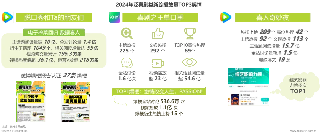 泛喜剧类新综TOP3均展现出极强的话题引爆能力,文娱热搜与高位热搜数量庞大,引发持续性的全网热议。