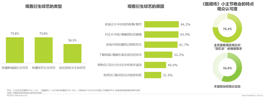 超过75%的综艺观看用户表示观看过热门影视剧和热门综艺的衍生综艺,影剧综联动已成为当前影视行业的重要趋势,通过不同形态的内容开发,释放IP的长尾效应和增量价值。这种模式不仅拓展了创作边界,还能促进产业协同发展。其中针对播出超10年的《甄嬛传》,晚会以“小主节”为主题,邀请演员以经典角色身份参与歌舞、访谈,激活集体记忆,76.4%的观看用户表示晚会满足了观众对“回忆杀”的情感需求,通过晚会的创新表达形式让IP成为观众情感历程的见证者与参与者。
